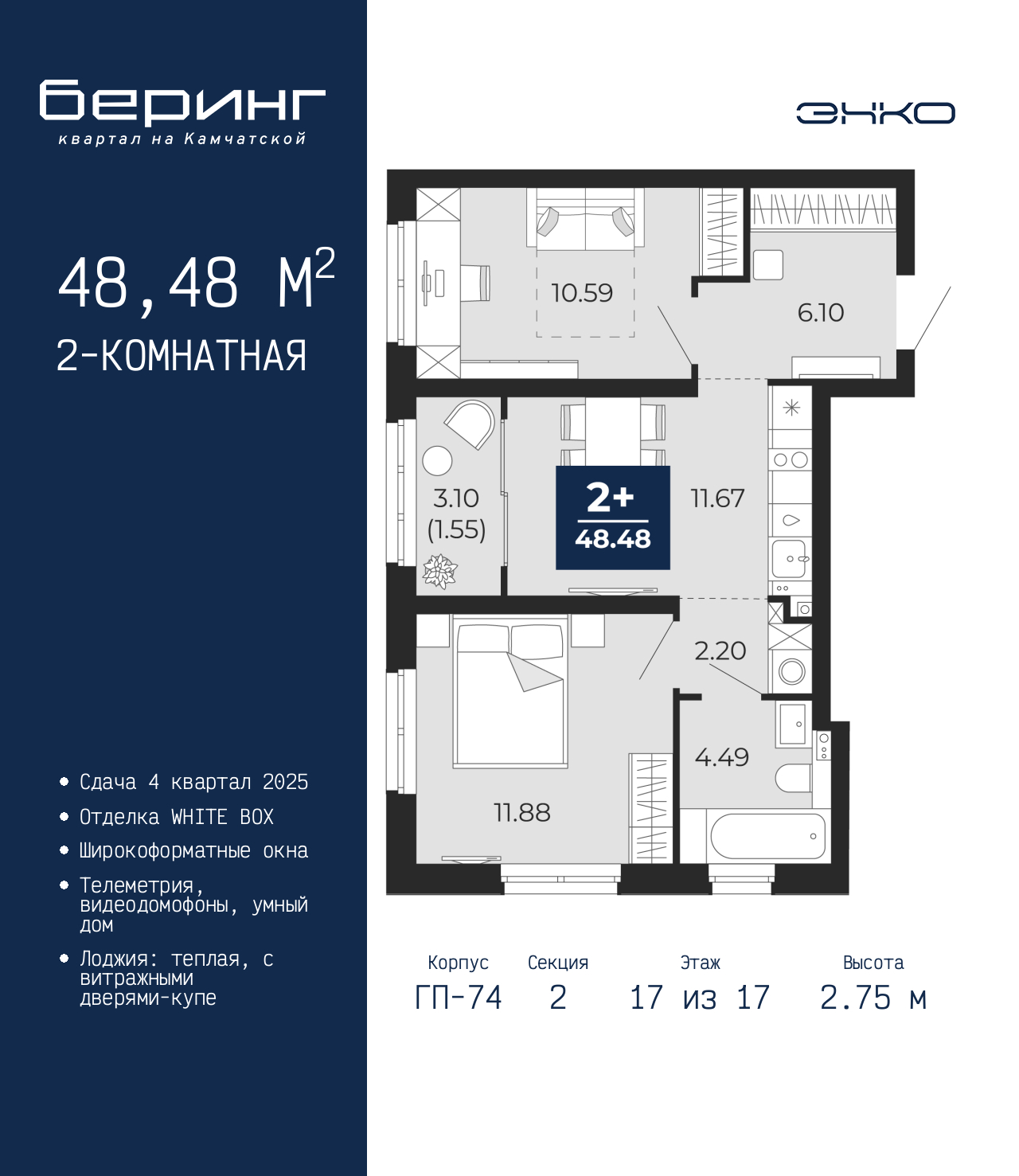 Продается 2-комн. квартира в ЖК "Беринг" на 17 этаже. Квартира без отделки, новый владелец может сделать ремонт по своему дизайн-проекту. Общая площадь: 48.48 кв.м., жилая: 22.47 кв.м., площадь просторной кухни-столовой: 11.67 кв.м. Угловая квартира, идеально подойдет любителям тишины и панорамных видов. В квартире одна лоджия, один совмещенный санузел. Высота потолков 2.75 м. Дом монолитный, многоподъездный, переменной этажности, от 9 до 21 этажей. Квартира находится во 2-й секции высотой 17 этажей в корпусе ГП-74. На этаже 7 квартир. В подъезде 1 пассажирский и 1 грузовой лифт. Окончание строительства - 4 квартал 2025 года. Оформление сделки по договору долевого участия. Подобно знаменитому исследователю, мы чувствуем себя первооткрывателями этой локации. Хотим показать новую суть места, сформировать для вас жизненный опыт, которого ещё не было. Беринг — район зелёного цвета. Беринг — район, который откроется вам с другой стороны. Впечатлит новым уровнем комфорта и качеством жизни. Беринг — открытие на карте города. Первый квартал расположен в районе Тура, в границах улиц: Камчатская – Западносибирская – Энтузиастов. Вокруг уже есть всё для того, чтобы ежедневная рутина была лишь частью жизни и не доставляла дискомфорта. Школы и детские сады, магазины и аптеки, поликлиника, места для семейного отдыха, пеших и велопрогулок, и даже рыбалки. Масштабное озеленение дворов — визитная карточка ЭНКО и ваш оазис спокойствия, чтобы отвлечься от повседневности. Раскидистые деревья, кустарники, травы и цветы — осталось остановиться, вдохнуть и расслабиться, глядя на эту природную красоту. Стилистика подъездов продолжает концепцию Беринга, вдохновлённого Камчаткой: сдержанный, но при этом впечатляющий дизайн соседствует с удобством и функциональностью. (AQID02315900)