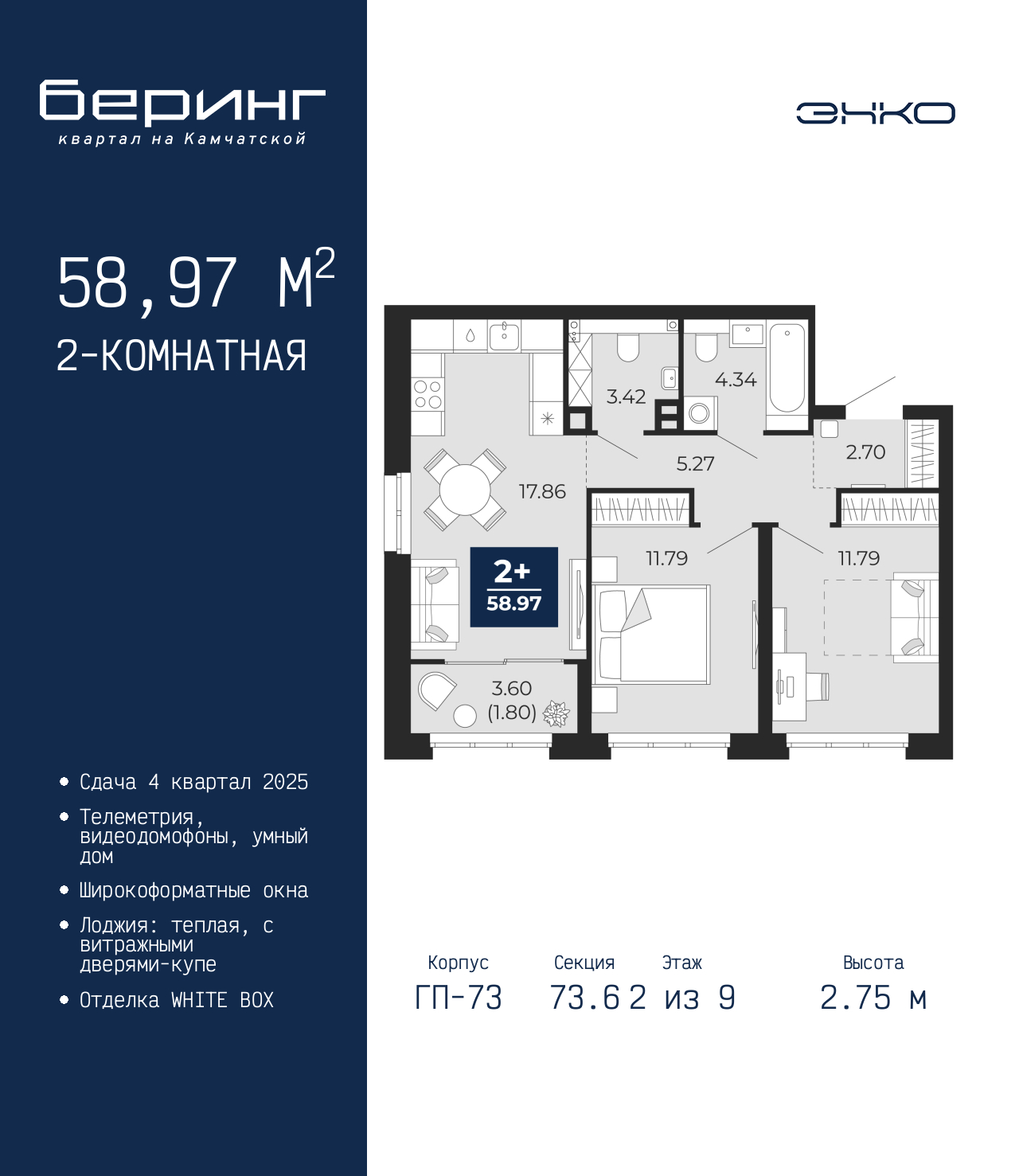 2-комн. квартира от застройщика в ЖК "Беринг" на 2 этаже. Квартира без отделки, после оформления собственности можно делать ремонт. Общая площадь: 58.97 кв.м., жилая: 23.58 кв.м., площадь просторной кухни-столовой: 17.86 кв.м. Квартира угловая, окна oбecпeчивaют paвнoмepнoe ocвeщeниe в тeчeниe дня. В квартире одна лоджия, один совмещенный и один раздельный санузел. Высота потолков 2.75 м. Дом монолитный, многоподъездный, переменной этажности, от 9 до 22 этажей. Квартира находится в 73.6-й секции высотой 9 этажей в корпусе ГП-73. На этаже 5 квартир. В подъезде 1 пассажирский и 1 грузовой лифт. Окончание строительства - 4 квартал 2025 года. Оформление сделки по договору долевого участия. Подобно знаменитому исследователю, мы чувствуем себя первооткрывателями этой локации. Хотим показать новую суть места, сформировать для вас жизненный опыт, которого ещё не было. Беринг — район зелёного цвета. Беринг — район, который откроется вам с другой стороны. Впечатлит новым уровнем комфорта и качеством жизни. Беринг — открытие на карте города. Первый квартал расположен в районе Тура, в границах улиц: Камчатская – Западносибирская – Энтузиастов. Вокруг уже есть всё для того, чтобы ежедневная рутина была лишь частью жизни и не доставляла дискомфорта. Школы и детские сады, магазины и аптеки, поликлиника, места для семейного отдыха, пеших и велопрогулок, и даже рыбалки. Масштабное озеленение дворов — визитная карточка ЭНКО и ваш оазис спокойствия, чтобы отвлечься от повседневности. Раскидистые деревья, кустарники, травы и цветы — осталось остановиться, вдохнуть и расслабиться, глядя на эту природную красоту. Стилистика подъездов продолжает концепцию Беринга, вдохновлённого Камчаткой: сдержанный, но при этом впечатляющий дизайн соседствует с удобством и функциональностью. (AQID02316040)