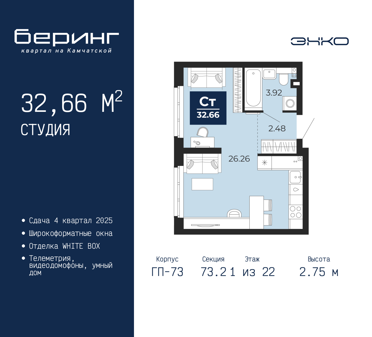 1-комн. квартира-студия от застройщика в ЖК "Беринг" на 1 этаже. Квартира без отделки, новый владелец может сделать ремонт по своему дизайн-проекту. Общая площадь: 32.66 кв.м., площадь гостиной 26.26 кв.м., из которых 5 кв.м. выделено под кухонную зону. Все окна выходят на одну сторону. В квартире один совмещенный санузел. Высота потолков 2.75 м. Дом монолитный, многоподъездный, переменной этажности, от 9 до 22 этажей. Квартира находится в 73.2-й секции высотой 22 этажа в корпусе ГП-73. На этаже 7 квартир. В подъезде 1 пассажирский и 1 грузовой лифт. Окончание строительства - 4 квартал 2025 года. Оформление сделки по договору долевого участия. Подобно знаменитому исследователю, мы чувствуем себя первооткрывателями этой локации. Хотим показать новую суть места, сформировать для вас жизненный опыт, которого ещё не было. Беринг — район зелёного цвета. Беринг — район, который откроется вам с другой стороны. Впечатлит новым уровнем комфорта и качеством жизни. Беринг — открытие на карте города. Первый квартал расположен в районе Тура, в границах улиц: Камчатская – Западносибирская – Энтузиастов. Вокруг уже есть всё для того, чтобы ежедневная рутина была лишь частью жизни и не доставляла дискомфорта. Школы и детские сады, магазины и аптеки, поликлиника, места для семейного отдыха, пеших и велопрогулок, и даже рыбалки. Масштабное озеленение дворов — визитная карточка ЭНКО и ваш оазис спокойствия, чтобы отвлечься от повседневности. Раскидистые деревья, кустарники, травы и цветы — осталось остановиться, вдохнуть и расслабиться, глядя на эту природную красоту. Стилистика подъездов продолжает концепцию Беринга, вдохновлённого Камчаткой: сдержанный, но при этом впечатляющий дизайн соседствует с удобством и функциональностью. (AQID02315550)