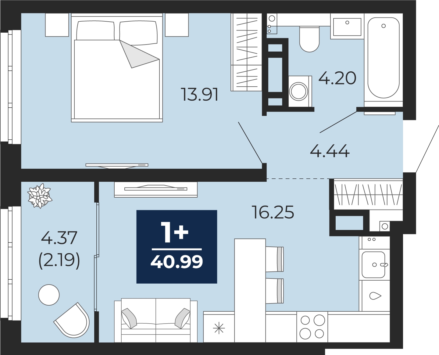 - Общая площадь 40.99 м²