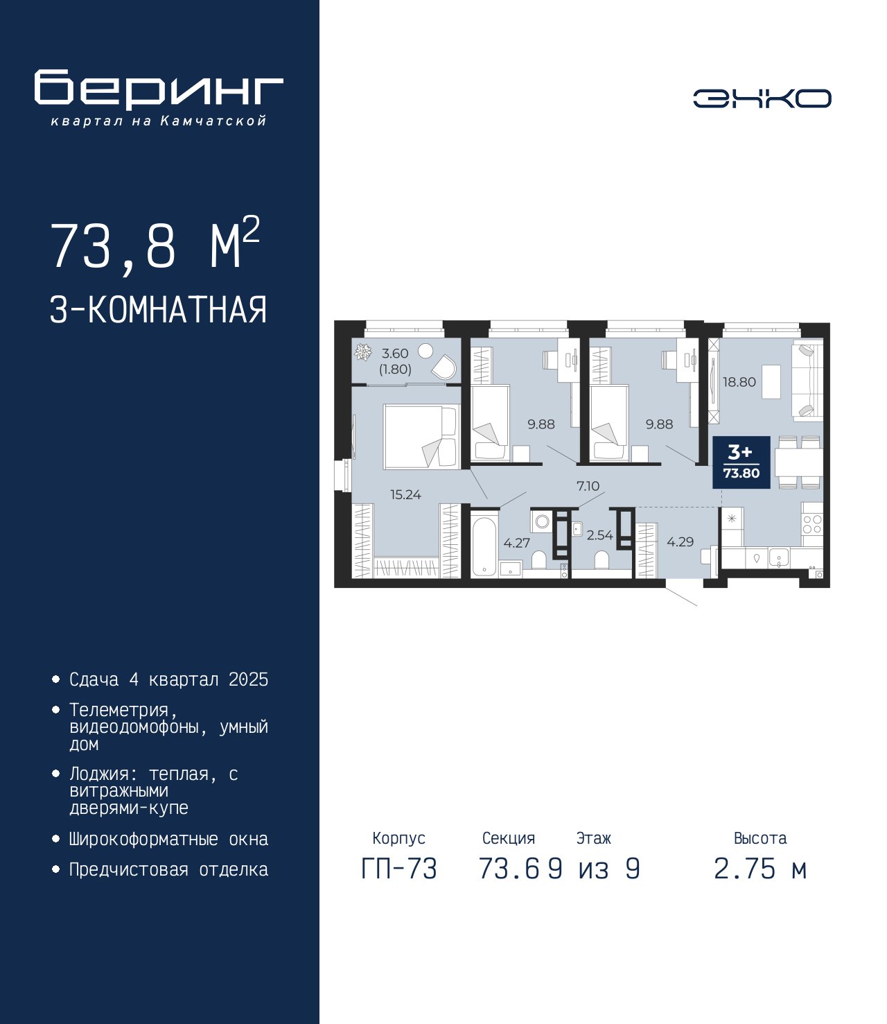 3-комн. квартира с предчистовой отделкой в ЖК "Беринг" на 9 этаже. Общая площадь: 73.8 кв.м., жилая: 35 кв.м., площадь просторной кухни-столовой: 18.8 кв.м. Квартира угловая, окна oбecпeчивaют paвнoмepнoe ocвeщeниe в тeчeниe дня. В квартире одна лоджия, один совмещенный и один раздельный санузел. Высота потолков 2.75 м. Дом монолитный, многоподъездный, переменной этажности, от 9 до 22 этажей. Квартира находится в 73.6-й секции высотой 9 этажей в корпусе ГП-73. На этаже 5 квартир. В подъезде 1 пассажирский и 1 грузовой лифт. Окончание строительства - 4 квартал 2025 года. Оформление сделки по договору долевого участия. Подобно знаменитому исследователю, мы чувствуем себя первооткрывателями этой локации. Хотим показать новую суть места, сформировать для вас жизненный опыт, которого ещё не было. Беринг — район зелёного цвета. Беринг — район, который откроется вам с другой стороны. Впечатлит новым уровнем комфорта и качеством жизни. Беринг — открытие на карте города. Первый квартал расположен в районе Тура, в границах улиц: Камчатская – Западносибирская – Энтузиастов. Вокруг уже есть всё для того, чтобы ежедневная рутина была лишь частью жизни и не доставляла дискомфорта. Школы и детские сады, магазины и аптеки, поликлиника, места для семейного отдыха, пеших и велопрогулок, и даже рыбалки. Масштабное озеленение дворов — визитная карточка ЭНКО и ваш оазис спокойствия, чтобы отвлечься от повседневности. Раскидистые деревья, кустарники, травы и цветы — осталось остановиться, вдохнуть и расслабиться, глядя на эту природную красоту. Стилистика подъездов продолжает концепцию Беринга, вдохновлённого Камчаткой: сдержанный, но при этом впечатляющий дизайн соседствует с удобством и функциональностью. (AQID02316305)