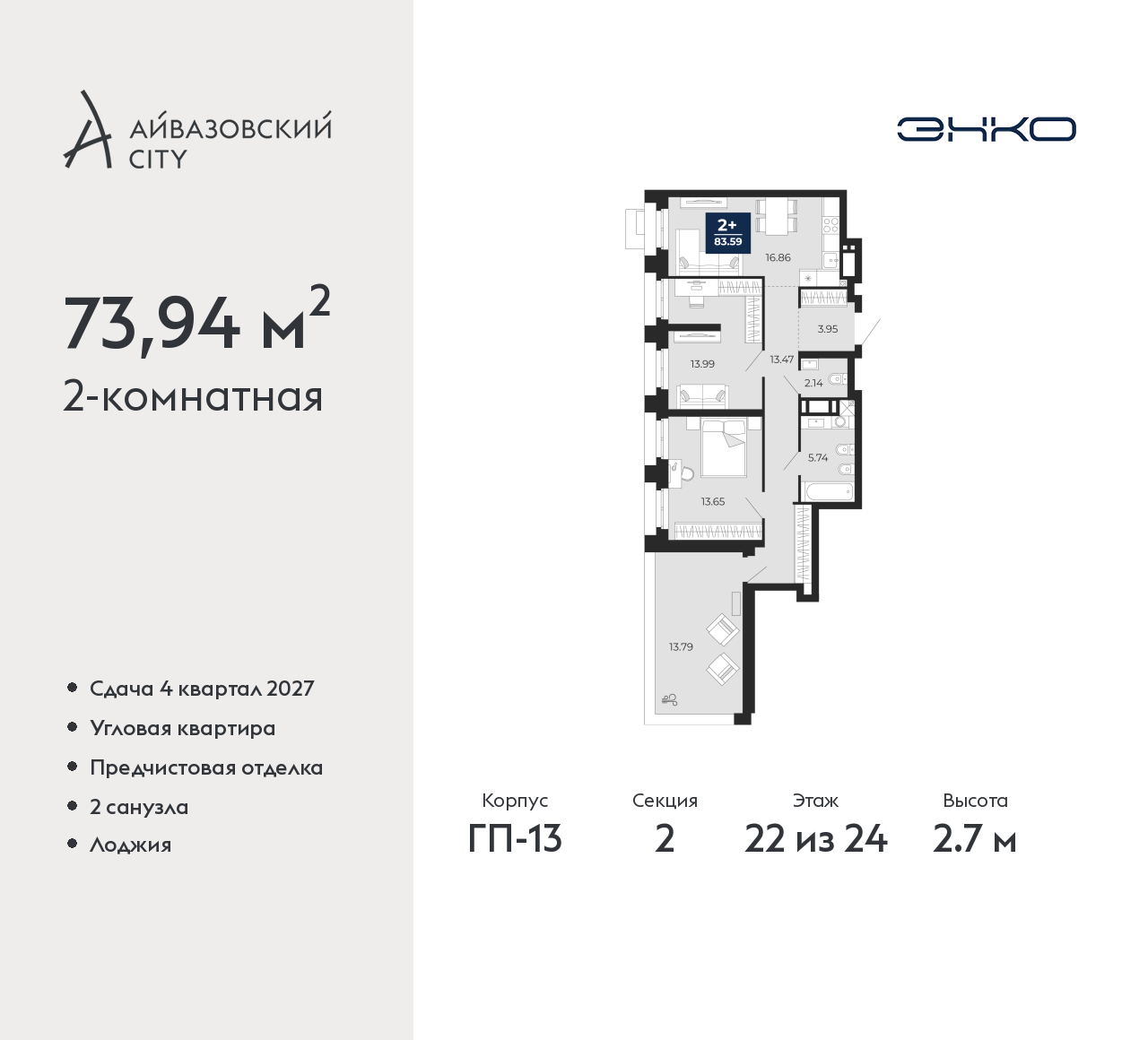 2-комн. квартира с предчистовой отделкой в ЖК "Айвазовский City" на 22 этаже. Общая площадь: 73.94 кв.м., жилая: 27.64 кв.м., площадь просторной кухни-столовой: 16.86 кв.м. Квартира угловая, очень светлая, естественная вентиляция при открытии окон. В квартире одна лоджия, один совмещенный и один раздельный санузел. Наличие террасы в квартире дает возможность для создания зон отдыха в кругу семьи и друзей. Высота потолков 2.7 м. Дом монолитный, многоподъездный, высотой 24 этажа. Квартира находится во 2-й секции в корпусе ГП-13. На этаже 6 квартир. В подъезде 1 пассажирский и 1 грузовой лифт. Окончание строительства - 4 квартал 2027 года. Оформление сделки по договору долевого участия. Новый жилой район располагается в живописном месте на берегу Туры в центральной части города. Принципиально новое пространство для жизни в центре современного города для тех, чьи мечты сбываются, кто нацелен на постоянный рост, перемены к лучшему для себя и своих близких. Каждая деталь Айвазовский City вдохновляет и заряжает на новые свершения: авторская архитектура, сбалансированная продуманная инфраструктура, дизайнерские дворы со спортивными и детскими площадками, парковые зоны с фонтанами, водный канал, украшающий центральный прогулочный маршрут района и многое другое. В 2019 года проект стал лауреатом престижной премии Urban Awards 2019 в номинации «Лучший строящийся региональный жилой комплекс бизнес-класса». Главная особенность Айвазовский City - соседство разных архитектурных школ в рамках одного дома. Изысканная классика, выразительная эклектика и оригинальный модерн - жить в одном из таких домов настоящий повод для гордости. Айвазовский City это идеальное сочетание комфорта, технологий и развитой инфраструктуры. Вход в подъезд возможен с улицы и со двора. Отправляясь на работу или за покупками, жители могут выйти с внешней стороны дома, а для прогулки с ребенком – со стороны двора. Экологически чистые материалы и энергосберегающие технологии, качественное освещение общественных зон, видеонаблюдение по всей территории жилого района (в том числе в подъездах, лифтах и в подземном паркинге), закрытые дворы с доступом только для жителей Айвазовский City. Часть домов в Айвазовский City будут оснащены подземным паркингом. Востребованный в нашем климатическом поясе формат хранения автомобилей защитит собственность владельца в любое время года. Аккредитация в банках: ОАО «Альфа-Банк», «Сбербанк России», ПАО Банк «ВТБ», ПАО «Газпромбанк», АО "ДОМ.РФ" и других. (AQID02525768)