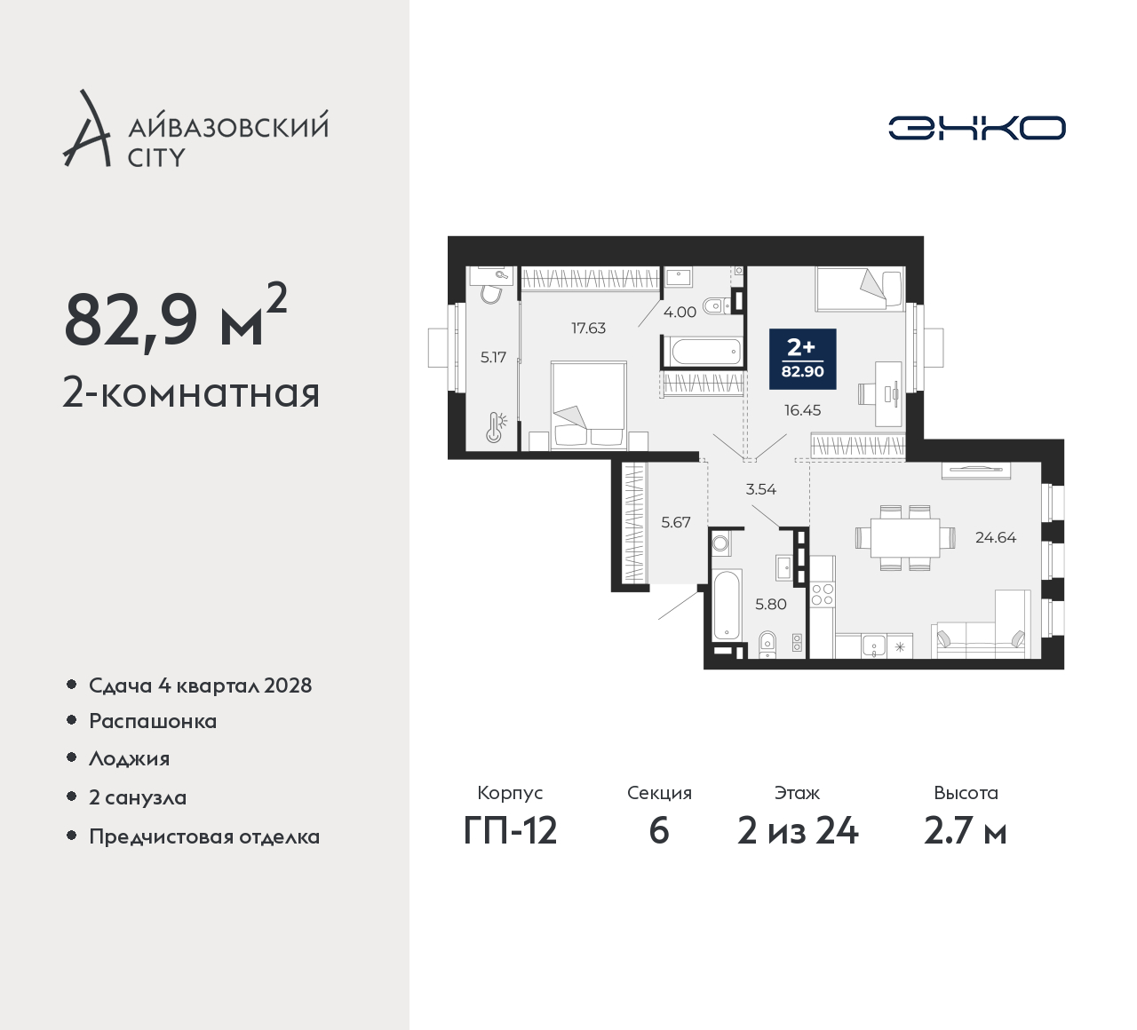 - Общая площадь 82.9 м²