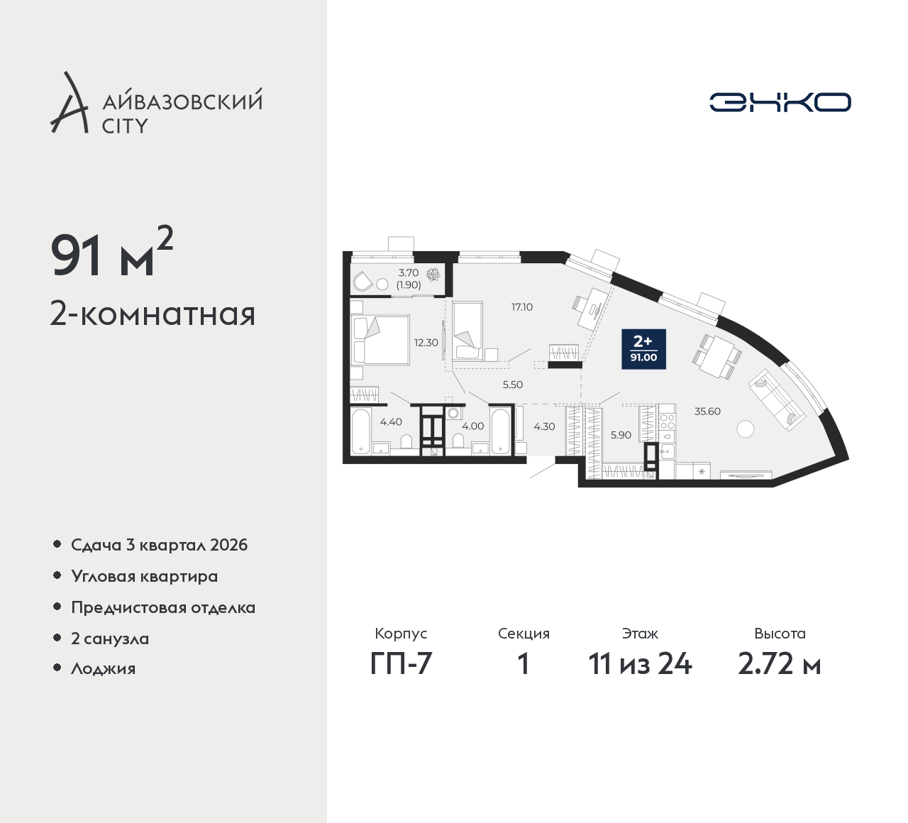 Двухкомнатная квартира с предчистовой отделкой в ЖК "Айвазовский City" на 11 этаже. Общая площадь: 91 кв.м., жилая: 29.4 кв.м., площадь просторной кухни-столовой: 35.6 кв.м. Угловая квартира, идеально подойдет любителям тишины и панорамных видов. В квартире одна лоджия, два совмещенных санузла. Высота потолков 2.72 м. Дом монолитный, многоподъездный, переменной этажности, от 9 до 24 этажей. Квартира находится в 1-й секции высотой 24 этажа в корпусе ГП-7. На этаже 6 квартир. В подъезде 1 пассажирский и 2 грузовых лифта. Окончание строительства - 3 квартал 2026 года. Оформление сделки по договору долевого участия. Новый жилой район располагается в живописном месте на берегу Туры в центральной части города. Принципиально новое пространство для жизни в центре современного города для тех, чьи мечты сбываются, кто нацелен на постоянный рост, перемены к лучшему для себя и своих близких. Каждая деталь Айвазовский City вдохновляет и заряжает на новые свершения: авторская архитектура, сбалансированная продуманная инфраструктура, дизайнерские дворы со спортивными и детскими площадками, парковые зоны с фонтанами, водный канал, украшающий центральный прогулочный маршрут района и многое другое. В 2019 года проект стал лауреатом престижной премии Urban Awards 2019 в номинации «Лучший строящийся региональный жилой комплекс бизнес-класса». Главная особенность Айвазовский City - соседство разных архитектурных школ в рамках одного дома. Изысканная классика, выразительная эклектика и оригинальный модерн - жить в одном из таких домов настоящий повод для гордости. Айвазовский City это идеальное сочетание комфорта, технологий и развитой инфраструктуры. Вход в подъезд возможен с улицы и со двора. Отправляясь на работу или за покупками, жители могут выйти с внешней стороны дома, а для прогулки с ребенком – со стороны двора. Экологически чистые материалы и энергосберегающие технологии, качественное освещение общественных зон, видеонаблюдение по всей территории жилого района (в том числе в подъездах, лифтах и в подземном паркинге), закрытые дворы с доступом только для жителей Айвазовский City. Часть домов в Айвазовский City будут оснащены подземным паркингом. Востребованный в нашем климатическом поясе формат хранения автомобилей защитит собственность владельца в любое время года. Аккредитация в банках: ПАО Банк «ВТБ», «Сбербанк России», ОАО «Альфа-Банк», ПАО «Газпромбанк», АО "ДОМ.РФ" и других. (AQID02526554)