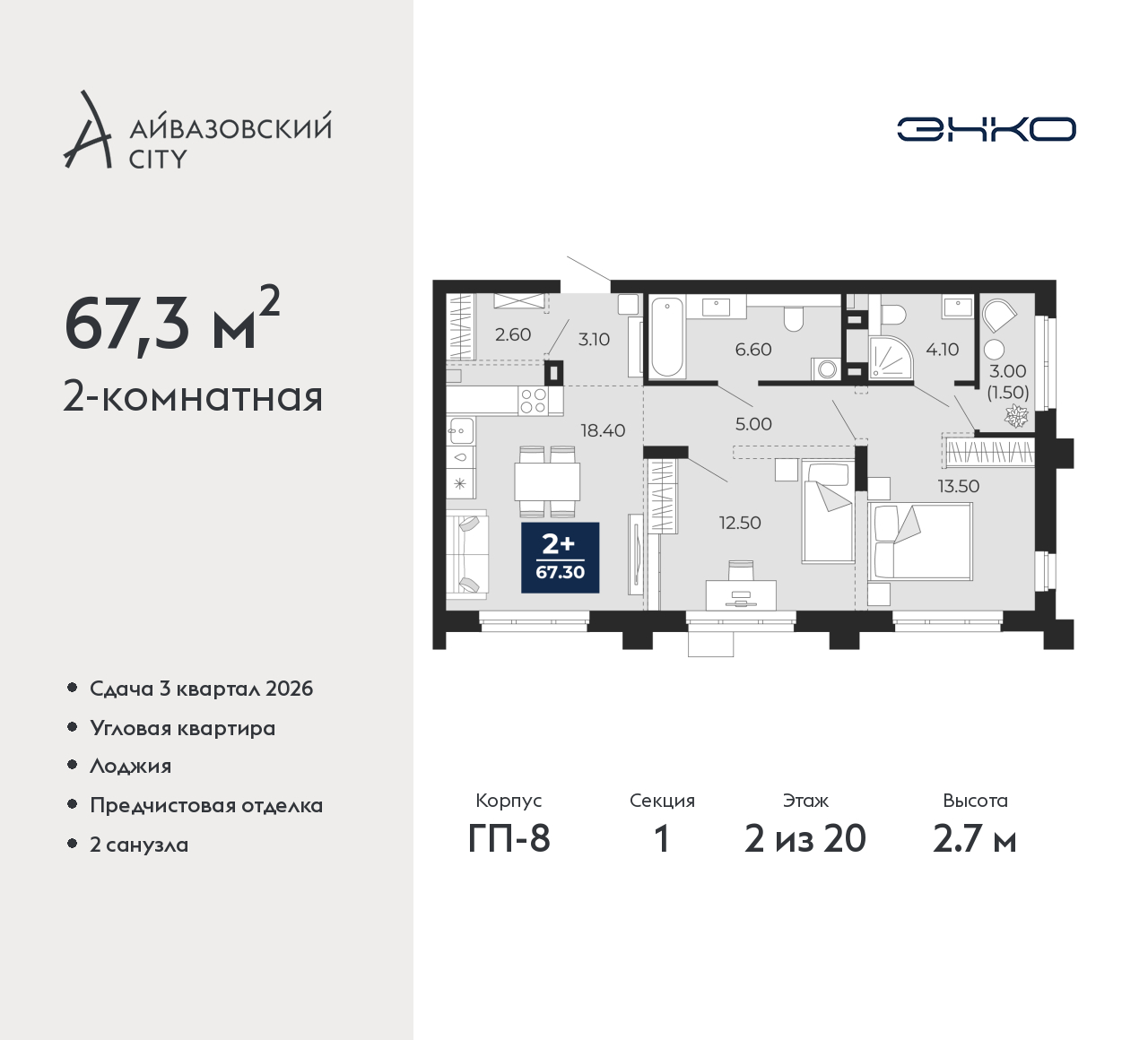 2-комн. квартира с предчистовой отделкой в ЖК "Айвазовский City" на 2 этаже. Общая площадь: 67.3 кв.м., жилая: 26 кв.м., площадь просторной кухни-столовой: 18.4 кв.м. Угловая квартира, идеально подойдет любителям тишины и панорамных видов. В квартире одна лоджия, два совмещенных санузла. Высота потолков 2.7 м. Дом монолитный, многоподъездный, переменной этажности, от 14 до 24 этажей. Квартира находится в 1-й секции высотой 20 этажей в корпусе ГП-8. На этаже 6 квартир. В подъезде 1 пассажирский и 1 грузовой лифт. Окончание строительства - 3 квартал 2026 года. Оформление сделки по договору долевого участия. Новый жилой район располагается в живописном месте на берегу Туры в центральной части города. Принципиально новое пространство для жизни в центре современного города для тех, чьи мечты сбываются, кто нацелен на постоянный рост, перемены к лучшему для себя и своих близких. Каждая деталь Айвазовский City вдохновляет и заряжает на новые свершения: авторская архитектура, сбалансированная продуманная инфраструктура, дизайнерские дворы со спортивными и детскими площадками, парковые зоны с фонтанами, водный канал, украшающий центральный прогулочный маршрут района и многое другое. В 2019 года проект стал лауреатом престижной премии Urban Awards 2019 в номинации «Лучший строящийся региональный жилой комплекс бизнес-класса». Главная особенность Айвазовский City - соседство разных архитектурных школ в рамках одного дома. Изысканная классика, выразительная эклектика и оригинальный модерн - жить в одном из таких домов настоящий повод для гордости. Айвазовский City это идеальное сочетание комфорта, технологий и развитой инфраструктуры. Вход в подъезд возможен с улицы и со двора. Отправляясь на работу или за покупками, жители могут выйти с внешней стороны дома, а для прогулки с ребенком – со стороны двора. Экологически чистые материалы и энергосберегающие технологии, качественное освещение общественных зон, видеонаблюдение по всей территории жилого района (в том числе в подъездах, лифтах и в подземном паркинге), закрытые дворы с доступом только для жителей Айвазовский City. Часть домов в Айвазовский City будут оснащены подземным паркингом. Востребованный в нашем климатическом поясе формат хранения автомобилей защитит собственность владельца в любое время года. Аккредитация в банках: ОАО «Альфа-Банк», ПАО «Газпромбанк», «Сбербанк России», ПАО Банк «ВТБ», ПАО «Совкомбанк» и других. (AQID02483694)