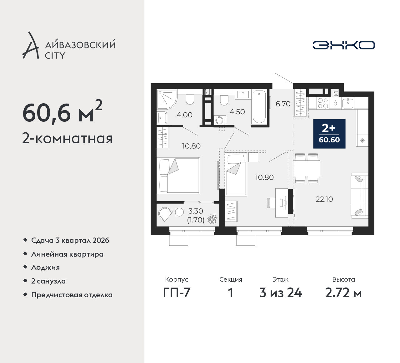Продается двухкомнатная квартира от застройщика с предчистовой отделкой в ЖК "Айвазовский City" на 3 этаже. Общая площадь: 60.6 кв.м., жилая: 21.6 кв.м., площадь просторной кухни-столовой: 22.1 кв.м. Комнаты изолированные, все окна выходят на одну сторону. В квартире одна лоджия, два совмещенных санузла. Высота потолков 2.72 м. Дом монолитный, многоподъездный, переменной этажности, от 9 до 24 этажей. Квартира находится в 1-й секции высотой 24 этажа в корпусе ГП-7. На этаже 6 квартир. В подъезде 1 пассажирский и 2 грузовых лифта. Окончание строительства - 3 квартал 2026 года. Оформление сделки по договору долевого участия. Новый жилой район располагается в живописном месте на берегу Туры в центральной части города. Принципиально новое пространство для жизни в центре современного города для тех, чьи мечты сбываются, кто нацелен на постоянный рост, перемены к лучшему для себя и своих близких. Каждая деталь Айвазовский City вдохновляет и заряжает на новые свершения: авторская архитектура, сбалансированная продуманная инфраструктура, дизайнерские дворы со спортивными и детскими площадками, парковые зоны с фонтанами, водный канал, украшающий центральный прогулочный маршрут района и многое другое. В 2019 года проект стал лауреатом престижной премии Urban Awards 2019 в номинации «Лучший строящийся региональный жилой комплекс бизнес-класса». Главная особенность Айвазовский City - соседство разных архитектурных школ в рамках одного дома. Изысканная классика, выразительная эклектика и оригинальный модерн - жить в одном из таких домов настоящий повод для гордости. Айвазовский City это идеальное сочетание комфорта, технологий и развитой инфраструктуры. Вход в подъезд возможен с улицы и со двора. Отправляясь на работу или за покупками, жители могут выйти с внешней стороны дома, а для прогулки с ребенком – со стороны двора. Экологически чистые материалы и энергосберегающие технологии, качественное освещение общественных зон, видеонаблюдение по всей территории жилого района (в том числе в подъездах, лифтах и в подземном паркинге), закрытые дворы с доступом только для жителей Айвазовский City. Часть домов в Айвазовский City будут оснащены подземным паркингом. Востребованный в нашем климатическом поясе формат хранения автомобилей защитит собственность владельца в любое время года. Аккредитация в банках: ПАО «Газпромбанк», «Сбербанк России», ОАО «Альфа-Банк», ПАО Банк «ВТБ», ПАО «Промсвязьбанк» и других. (AQID02487887)