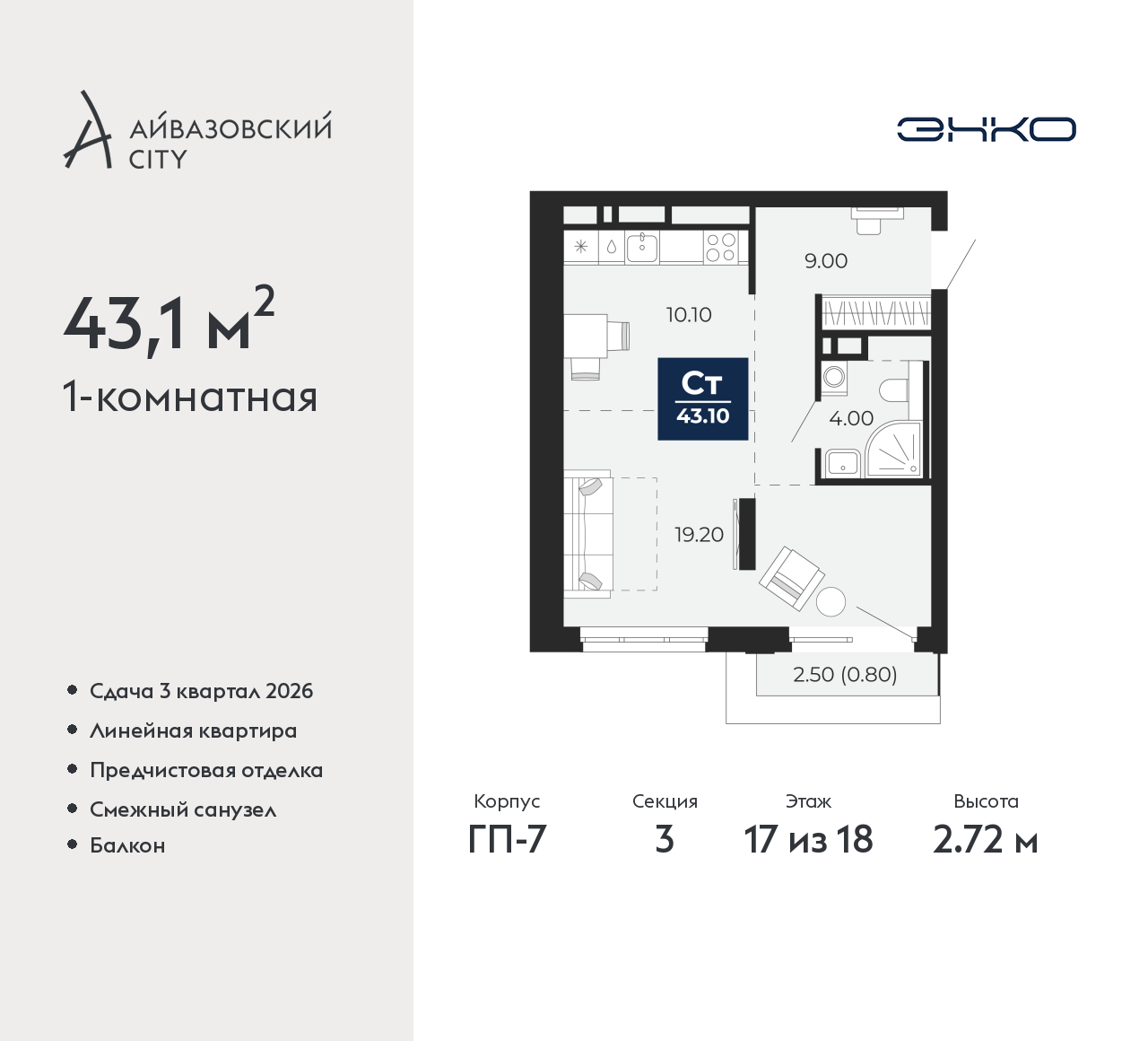 - Общая площадь 43.1 м²