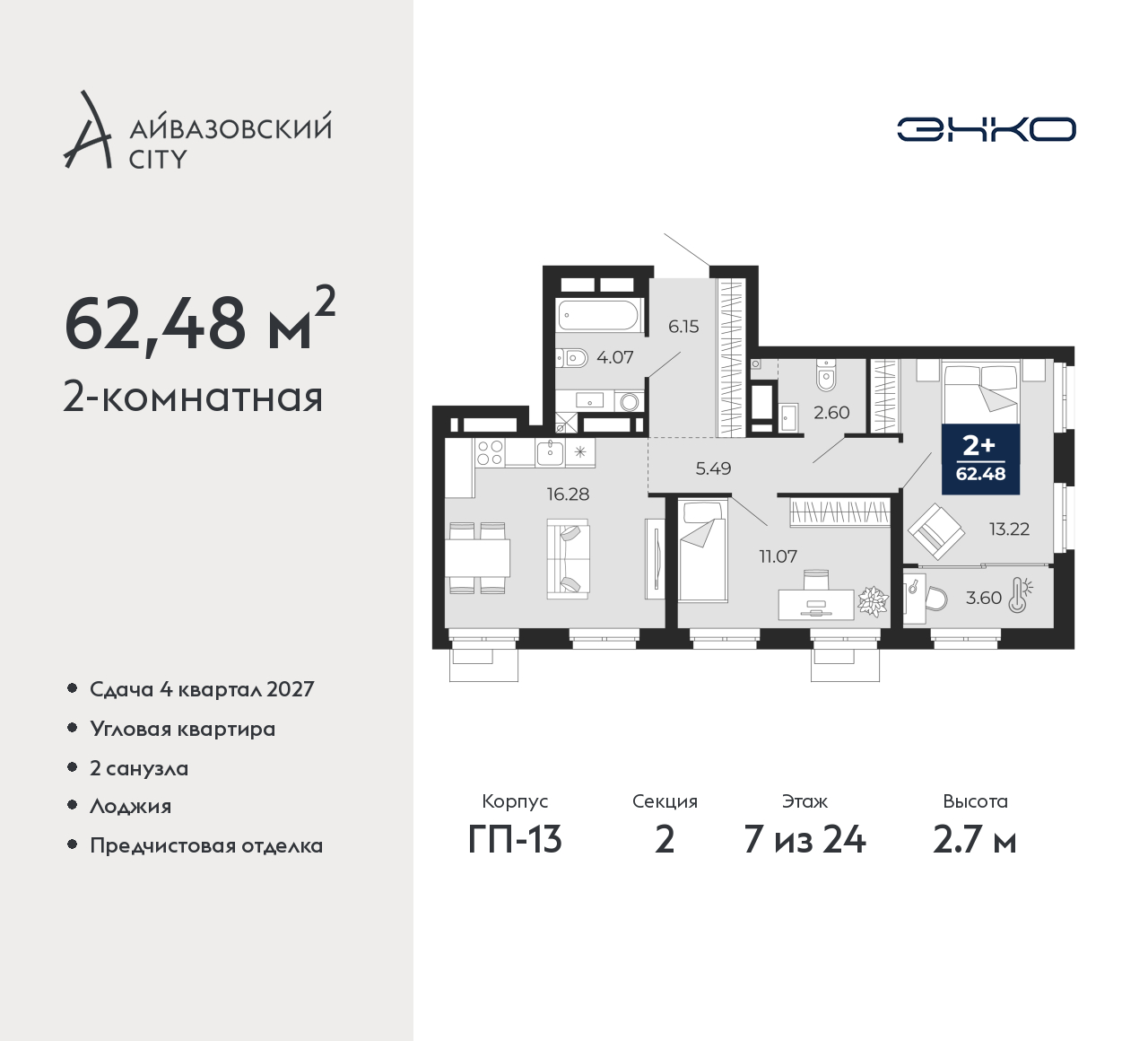 - Общая площадь 62.48 м²