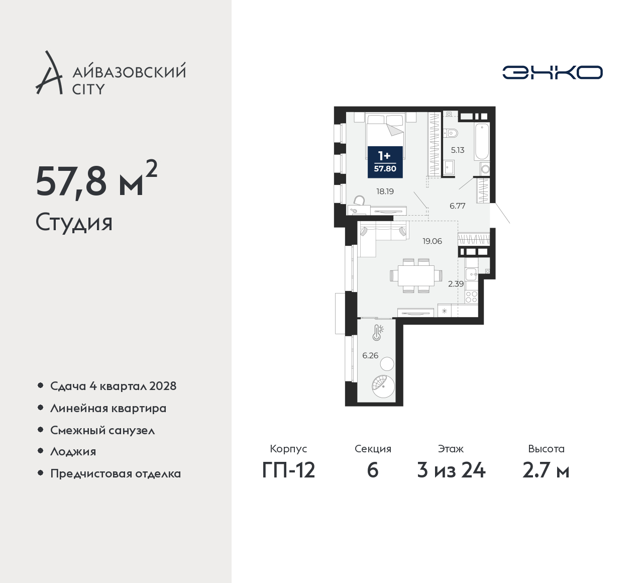 2-комн. квартира с европланировкой и предчистовой отделкой в ЖК "Айвазовский City" на 3 этаже. Общая площадь: 57.8 кв.м., жилая: 37.25 кв.м., суммарная площадь гостиной-столовой с кухонной зоной: 21.45 кв.м. Европейская планировка, за счет большой площади кухни-гостиной квартира выглядит просторной и очень удобна для жизни. Комнаты изолированные, все окна выходят на одну сторону. В квартире одна лоджия, один совмещенный санузел. Высота потолков 2.7 м. Дом монолитный, многоподъездный, высотой 24 этажа. Квартира находится в 6-й секции в корпусе ГП-12. На этаже 5 квартир. В подъезде 1 пассажирский и 1 грузовой лифт. Окончание строительства - 4 квартал 2028 года. Оформление сделки по договору долевого участия. Новый жилой район располагается в живописном месте на берегу Туры в центральной части города. Принципиально новое пространство для жизни в центре современного города для тех, чьи мечты сбываются, кто нацелен на постоянный рост, перемены к лучшему для себя и своих близких. Каждая деталь Айвазовский City вдохновляет и заряжает на новые свершения: авторская архитектура, сбалансированная продуманная инфраструктура, дизайнерские дворы со спортивными и детскими площадками, парковые зоны с фонтанами, водный канал, украшающий центральный прогулочный маршрут района и многое другое. В 2019 года проект стал лауреатом престижной премии Urban Awards 2019 в номинации «Лучший строящийся региональный жилой комплекс бизнес-класса». Главная особенность Айвазовский City - соседство разных архитектурных школ в рамках одного дома. Изысканная классика, выразительная эклектика и оригинальный модерн - жить в одном из таких домов настоящий повод для гордости. Айвазовский City это идеальное сочетание комфорта, технологий и развитой инфраструктуры. Вход в подъезд возможен с улицы и со двора. Отправляясь на работу или за покупками, жители могут выйти с внешней стороны дома, а для прогулки с ребенком – со стороны двора. Экологически чистые материалы и энергосберегающие технологии, качественное освещение общественных зон, видеонаблюдение по всей территории жилого района (в том числе в подъездах, лифтах и в подземном паркинге), закрытые дворы с доступом только для жителей Айвазовский City. Часть домов в Айвазовский City будут оснащены подземным паркингом. Востребованный в нашем климатическом поясе формат хранения автомобилей защитит собственность владельца в любое время года. Аккредитация в банках: ОАО «Альфа-Банк», ПАО Банк «ВТБ», ПАО «Газпромбанк», «Сбербанк России», ПАО «Промсвязьбанк» и других. (AQID02525697)