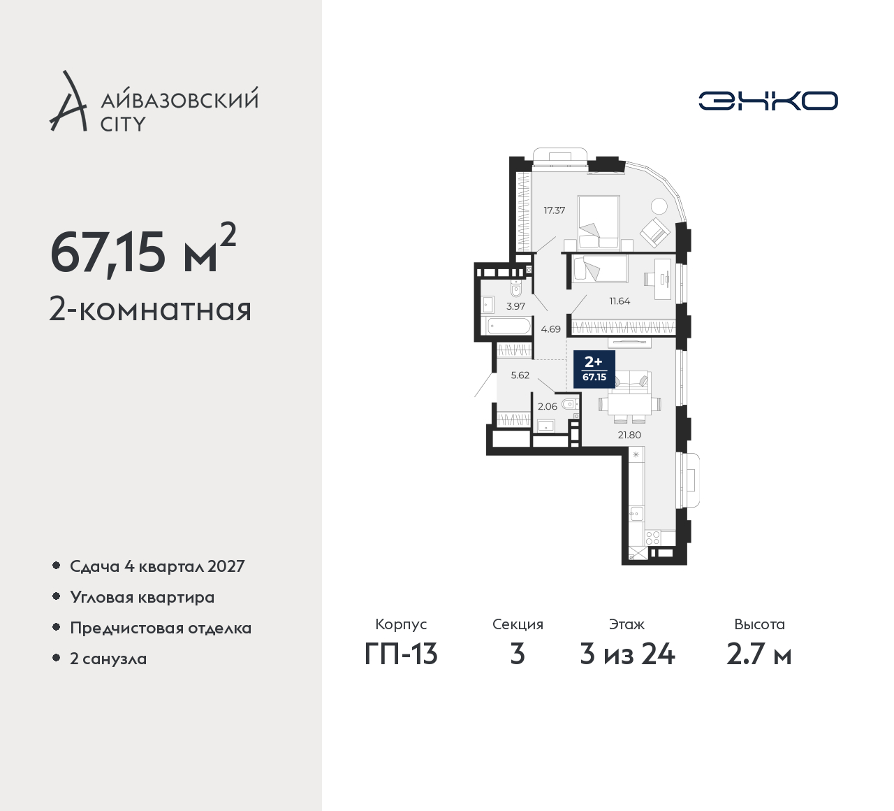 - Общая площадь 67.15 м²