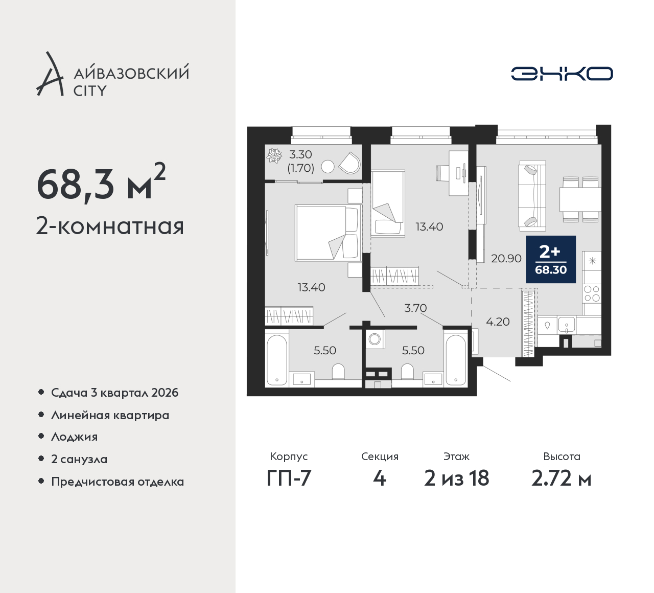 - Общая площадь 68.3 м²