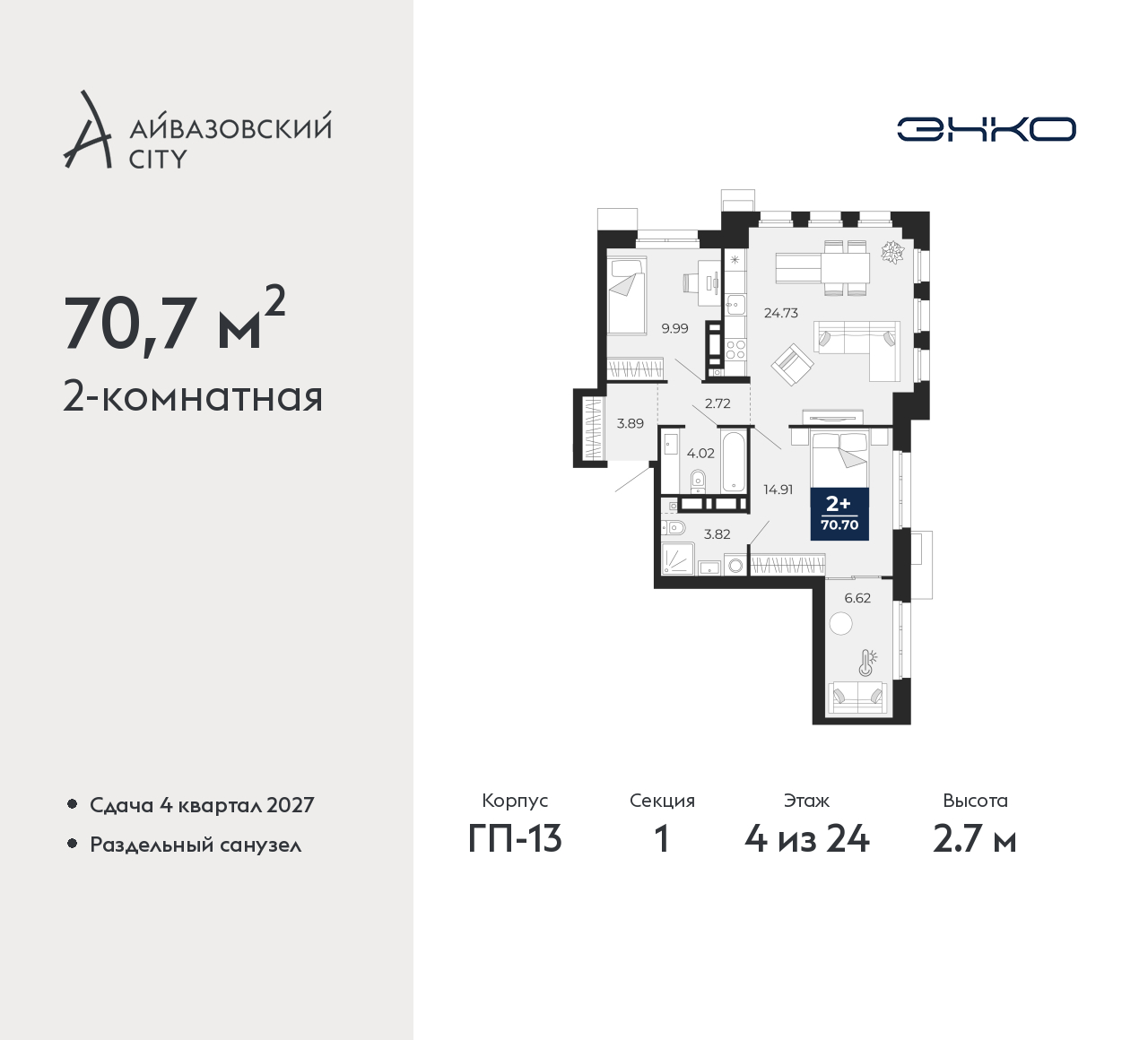 - Общая площадь 70.7 м²