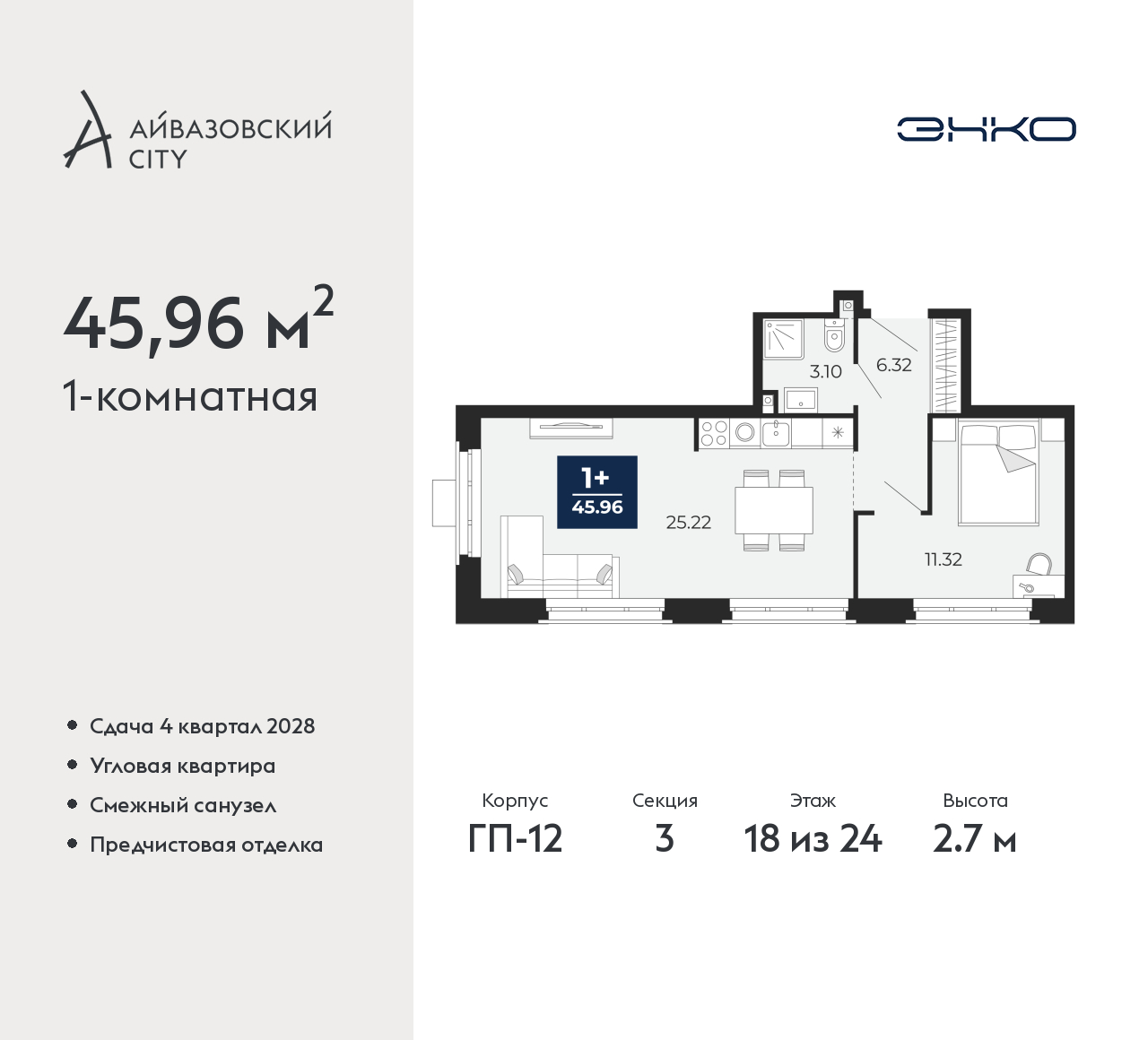 Однокомнатная квартира с предчистовой отделкой в ЖК "Айвазовский City" на 18 этаже. Общая площадь: 45.96 кв.м., жилая: 11.32 кв.м., площадь просторной кухни-столовой: 25.22 кв.м. Квартира угловая, очень светлая, естественная вентиляция при открытии окон. В квартире один совмещенный санузел. Высота потолков 2.7 м. Дом монолитный, многоподъездный, высотой 24 этажа. Квартира находится в 3-й секции в корпусе ГП-12. На этаже 6 квартир. В подъезде 1 пассажирский и 1 грузовой лифт. Окончание строительства - 4 квартал 2028 года. Оформление сделки по договору долевого участия. Новый жилой район располагается в живописном месте на берегу Туры в центральной части города. Принципиально новое пространство для жизни в центре современного города для тех, чьи мечты сбываются, кто нацелен на постоянный рост, перемены к лучшему для себя и своих близких. Каждая деталь Айвазовский City вдохновляет и заряжает на новые свершения: авторская архитектура, сбалансированная продуманная инфраструктура, дизайнерские дворы со спортивными и детскими площадками, парковые зоны с фонтанами, водный канал, украшающий центральный прогулочный маршрут района и многое другое. В 2019 года проект стал лауреатом престижной премии Urban Awards 2019 в номинации «Лучший строящийся региональный жилой комплекс бизнес-класса». Главная особенность Айвазовский City - соседство разных архитектурных школ в рамках одного дома. Изысканная классика, выразительная эклектика и оригинальный модерн - жить в одном из таких домов настоящий повод для гордости. Айвазовский City это идеальное сочетание комфорта, технологий и развитой инфраструктуры. Вход в подъезд возможен с улицы и со двора. Отправляясь на работу или за покупками, жители могут выйти с внешней стороны дома, а для прогулки с ребенком – со стороны двора. Экологически чистые материалы и энергосберегающие технологии, качественное освещение общественных зон, видеонаблюдение по всей территории жилого района (в том числе в подъездах, лифтах и в подземном паркинге), закрытые дворы с доступом только для жителей Айвазовский City. Часть домов в Айвазовский City будут оснащены подземным паркингом. Востребованный в нашем климатическом поясе формат хранения автомобилей защитит собственность владельца в любое время года. Аккредитация в банках: ОАО «Альфа-Банк», «Сбербанк России», ПАО «Газпромбанк», ПАО Банк «ВТБ», ПАО АКБ «Абсолют Банк» и других. (AQID02525696)
