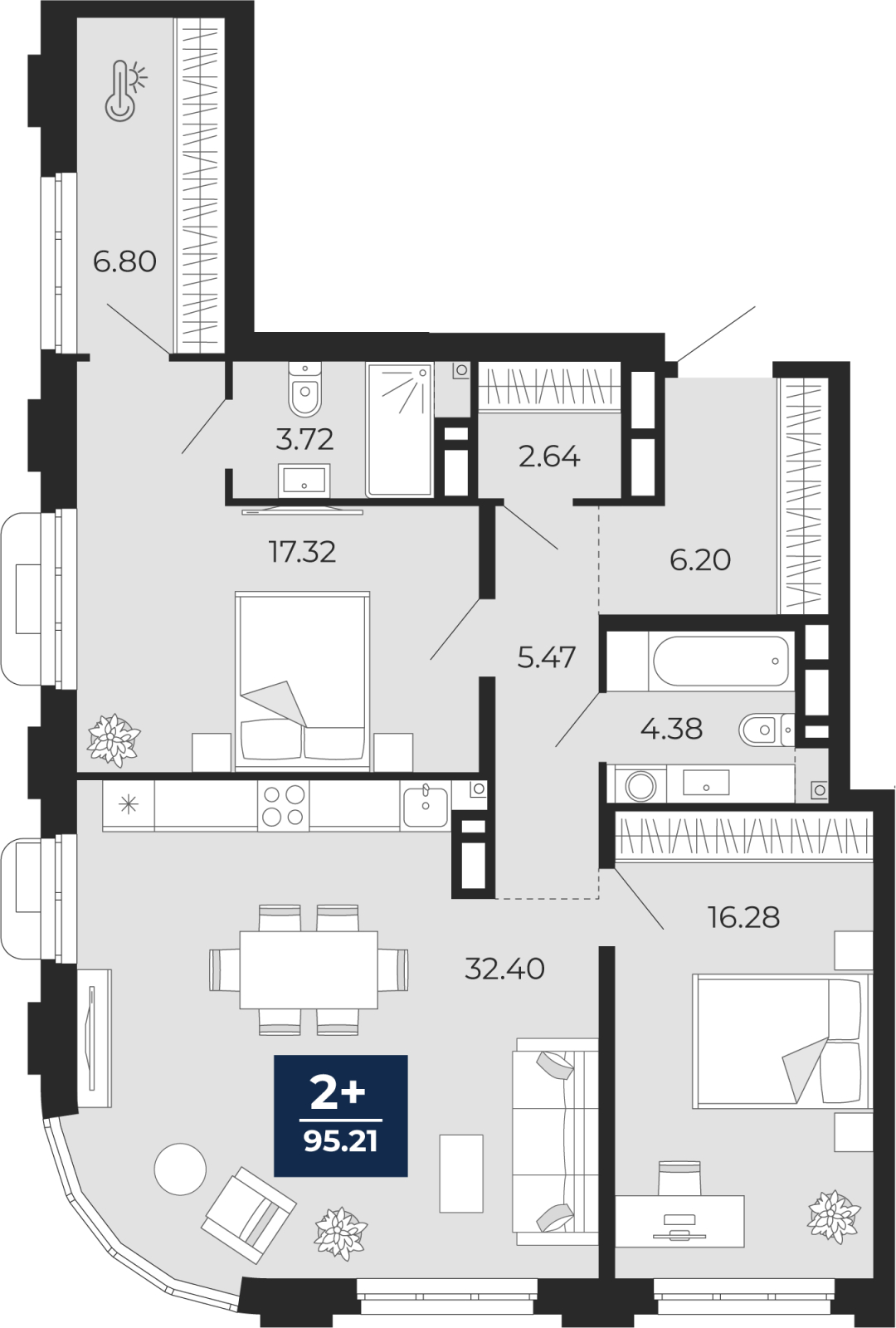 Продается двухкомнатная квартира с предчистовой отделкой в ЖК "Айвазовский City" на 7 этаже. Общая площадь: 95.21 кв.м., жилая: 33.6 кв.м., площадь просторной кухни-столовой: 32.4 кв.м. Квартира угловая, окна oбecпeчивaют paвнoмepнoe ocвeщeниe в тeчeниe дня. В квартире два совмещенных санузла. Высота потолков 2.7 м. Дом монолитный, многоподъездный, высотой 24 этажа. Квартира находится в 4-й секции в корпусе ГП-13. На этаже 6 квартир. В подъезде 1 пассажирский и 1 грузовой лифт. Окончание строительства - 4 квартал 2027 года. Оформление сделки по договору долевого участия. Новый жилой район располагается в живописном месте на берегу Туры в центральной части города. Принципиально новое пространство для жизни в центре современного города для тех, чьи мечты сбываются, кто нацелен на постоянный рост, перемены к лучшему для себя и своих близких. Каждая деталь Айвазовский City вдохновляет и заряжает на новые свершения: авторская архитектура, сбалансированная продуманная инфраструктура, дизайнерские дворы со спортивными и детскими площадками, парковые зоны с фонтанами, водный канал, украшающий центральный прогулочный маршрут района и многое другое. В 2019 года проект стал лауреатом престижной премии Urban Awards 2019 в номинации «Лучший строящийся региональный жилой комплекс бизнес-класса». Главная особенность Айвазовский City - соседство разных архитектурных школ в рамках одного дома. Изысканная классика, выразительная эклектика и оригинальный модерн - жить в одном из таких домов настоящий повод для гордости. Айвазовский City это идеальное сочетание комфорта, технологий и развитой инфраструктуры. Вход в подъезд возможен с улицы и со двора. Отправляясь на работу или за покупками, жители могут выйти с внешней стороны дома, а для прогулки с ребенком – со стороны двора. Экологически чистые материалы и энергосберегающие технологии, качественное освещение общественных зон, видеонаблюдение по всей территории жилого района (в том числе в подъездах, лифтах и в подземном паркинге), закрытые дворы с доступом только для жителей Айвазовский City. Часть домов в Айвазовский City будут оснащены подземным паркингом. Востребованный в нашем климатическом поясе формат хранения автомобилей защитит собственность владельца в любое время года. Аккредитация в банках: ПАО «Газпромбанк», ПАО Банк «ВТБ», ОАО «Альфа-Банк», «Сбербанк России», АО "ДОМ.РФ" и других. (AQID02525773)