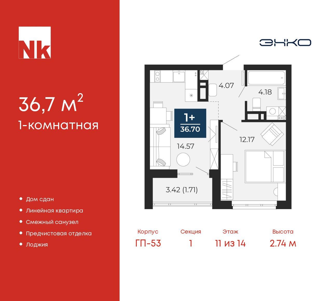 - Общая площадь 36.7 м²