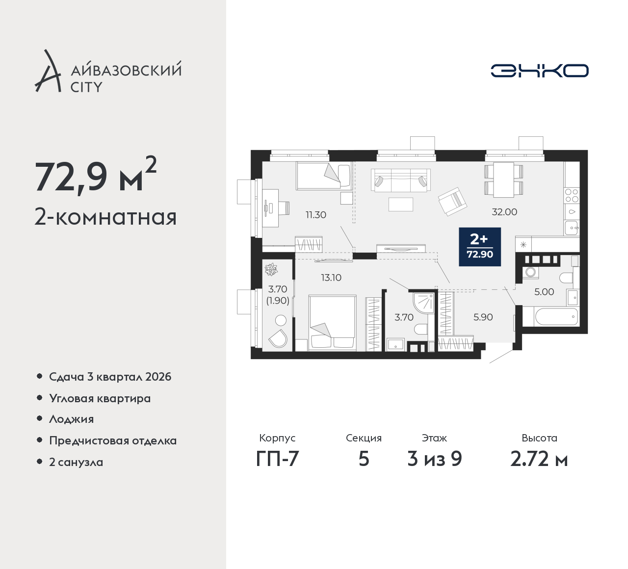 2-комн. квартира от застройщика с предчистовой отделкой в ЖК "Айвазовский City" на 3 этаже. Общая площадь: 72.9 кв.м., жилая: 24.4 кв.м., площадь просторной кухни-столовой: 32 кв.м. Угловая квартира, идеально подойдет любителям тишины и панорамных видов. В квартире одна лоджия, два совмещенных санузла. Высота потолков 2.72 м. Дом монолитный, многоподъездный, переменной этажности, от 9 до 24 этажей. Квартира находится в 5-й секции высотой 9 этажей в корпусе ГП-7. На этаже 7 квартир. В подъезде 1 пассажирский и 2 грузовых лифта. Окончание строительства - 3 квартал 2026 года. Оформление сделки по договору долевого участия. Новый жилой район располагается в живописном месте на берегу Туры в центральной части города. Принципиально новое пространство для жизни в центре современного города для тех, чьи мечты сбываются, кто нацелен на постоянный рост, перемены к лучшему для себя и своих близких. Каждая деталь Айвазовский City вдохновляет и заряжает на новые свершения: авторская архитектура, сбалансированная продуманная инфраструктура, дизайнерские дворы со спортивными и детскими площадками, парковые зоны с фонтанами, водный канал, украшающий центральный прогулочный маршрут района и многое другое. В 2019 года проект стал лауреатом престижной премии Urban Awards 2019 в номинации «Лучший строящийся региональный жилой комплекс бизнес-класса». Главная особенность Айвазовский City - соседство разных архитектурных школ в рамках одного дома. Изысканная классика, выразительная эклектика и оригинальный модерн - жить в одном из таких домов настоящий повод для гордости. Айвазовский City это идеальное сочетание комфорта, технологий и развитой инфраструктуры. Вход в подъезд возможен с улицы и со двора. Отправляясь на работу или за покупками, жители могут выйти с внешней стороны дома, а для прогулки с ребенком – со стороны двора. Экологически чистые материалы и энергосберегающие технологии, качественное освещение общественных зон, видеонаблюдение по всей территории жилого района (в том числе в подъездах, лифтах и в подземном паркинге), закрытые дворы с доступом только для жителей Айвазовский City. Часть домов в Айвазовский City будут оснащены подземным паркингом. Востребованный в нашем климатическом поясе формат хранения автомобилей защитит собственность владельца в любое время года. Аккредитация в банках: «Сбербанк России», ПАО Банк «ВТБ», ОАО «Альфа-Банк», ПАО «Газпромбанк», ПАО АКБ «Абсолют Банк» и других. (AQID02343186)
