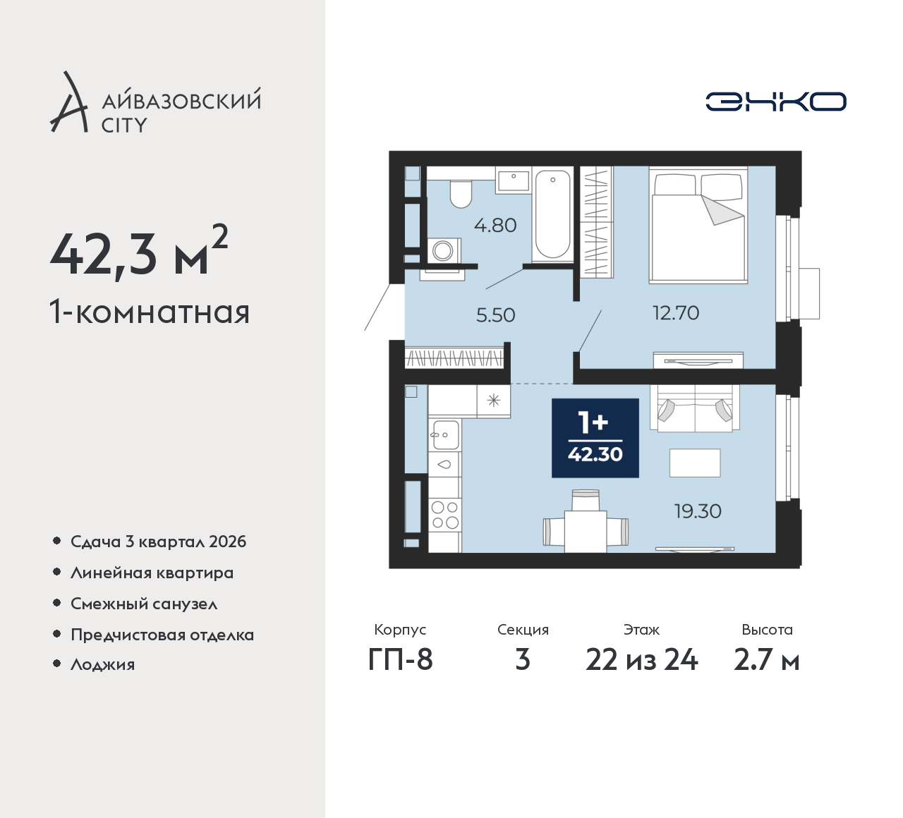 - Общая площадь 42.3 м²