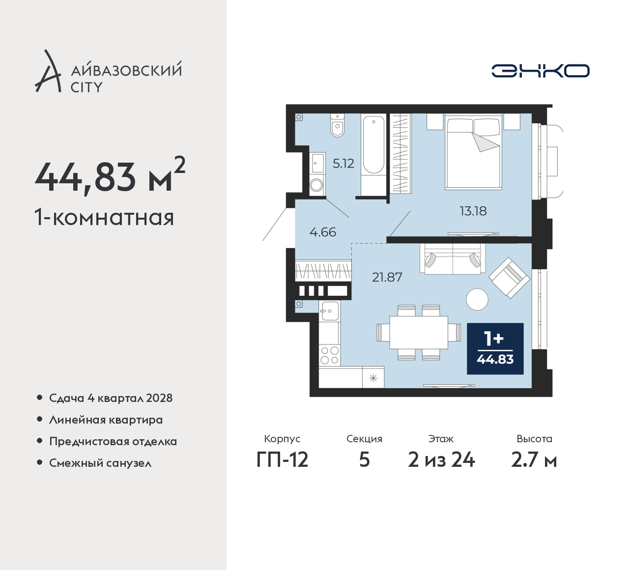 Просторная 1-комн. квартира с предчистовой отделкой в ЖК "Айвазовский City" на 2 этаже. Общая площадь: 44.83 кв.м., жилая: 13.18 кв.м., площадь просторной кухни-столовой: 21.87 кв.м. Все окна выходят на одну сторону. В квартире один совмещенный санузел. Высота потолков 2.7 м. Дом монолитный, многоподъездный, высотой 24 этажа. Квартира находится в 5-й секции в корпусе ГП-12. На этаже 5 квартир. В подъезде 1 пассажирский и 1 грузовой лифт. Окончание строительства - 4 квартал 2028 года. Оформление сделки по договору долевого участия. Новый жилой район располагается в живописном месте на берегу Туры в центральной части города. Принципиально новое пространство для жизни в центре современного города для тех, чьи мечты сбываются, кто нацелен на постоянный рост, перемены к лучшему для себя и своих близких. Каждая деталь Айвазовский City вдохновляет и заряжает на новые свершения: авторская архитектура, сбалансированная продуманная инфраструктура, дизайнерские дворы со спортивными и детскими площадками, парковые зоны с фонтанами, водный канал, украшающий центральный прогулочный маршрут района и многое другое. В 2019 года проект стал лауреатом престижной премии Urban Awards 2019 в номинации «Лучший строящийся региональный жилой комплекс бизнес-класса». Главная особенность Айвазовский City - соседство разных архитектурных школ в рамках одного дома. Изысканная классика, выразительная эклектика и оригинальный модерн - жить в одном из таких домов настоящий повод для гордости. Айвазовский City это идеальное сочетание комфорта, технологий и развитой инфраструктуры. Вход в подъезд возможен с улицы и со двора. Отправляясь на работу или за покупками, жители могут выйти с внешней стороны дома, а для прогулки с ребенком – со стороны двора. Экологически чистые материалы и энергосберегающие технологии, качественное освещение общественных зон, видеонаблюдение по всей территории жилого района (в том числе в подъездах, лифтах и в подземном паркинге), закрытые дворы с доступом только для жителей Айвазовский City. Часть домов в Айвазовский City будут оснащены подземным паркингом. Востребованный в нашем климатическом поясе формат хранения автомобилей защитит собственность владельца в любое время года. Аккредитация в банках: ПАО Банк «ВТБ», «Сбербанк России», ОАО «Альфа-Банк», ПАО «Газпромбанк», ПАО Банк «ФК Открытие» и других. (AQID02525585)