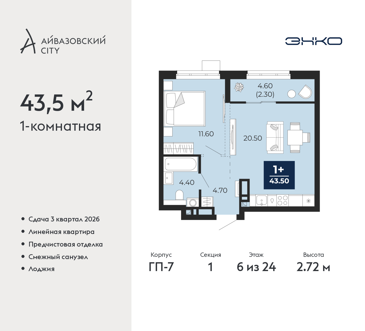 Продается однокомнатная квартира с предчистовой отделкой в ЖК "Айвазовский City" на 6 этаже. Общая площадь: 43.5 кв.м., жилая: 11.6 кв.м., площадь просторной кухни-столовой: 20.5 кв.м. Все окна выходят на одну сторону. В квартире одна лоджия, один совмещенный санузел. Высота потолков 2.72 м. Дом монолитный, многоподъездный, переменной этажности, от 9 до 24 этажей. Квартира находится в 1-й секции высотой 24 этажа в корпусе ГП-7. На этаже 6 квартир. В подъезде 1 пассажирский и 2 грузовых лифта. Окончание строительства - 3 квартал 2026 года. Оформление сделки по договору долевого участия. Новый жилой район располагается в живописном месте на берегу Туры в центральной части города. Принципиально новое пространство для жизни в центре современного города для тех, чьи мечты сбываются, кто нацелен на постоянный рост, перемены к лучшему для себя и своих близких. Каждая деталь Айвазовский City вдохновляет и заряжает на новые свершения: авторская архитектура, сбалансированная продуманная инфраструктура, дизайнерские дворы со спортивными и детскими площадками, парковые зоны с фонтанами, водный канал, украшающий центральный прогулочный маршрут района и многое другое. В 2019 года проект стал лауреатом престижной премии Urban Awards 2019 в номинации «Лучший строящийся региональный жилой комплекс бизнес-класса». Главная особенность Айвазовский City - соседство разных архитектурных школ в рамках одного дома. Изысканная классика, выразительная эклектика и оригинальный модерн - жить в одном из таких домов настоящий повод для гордости. Айвазовский City это идеальное сочетание комфорта, технологий и развитой инфраструктуры. Вход в подъезд возможен с улицы и со двора. Отправляясь на работу или за покупками, жители могут выйти с внешней стороны дома, а для прогулки с ребенком – со стороны двора. Экологически чистые материалы и энергосберегающие технологии, качественное освещение общественных зон, видеонаблюдение по всей территории жилого района (в том числе в подъездах, лифтах и в подземном паркинге), закрытые дворы с доступом только для жителей Айвазовский City. Часть домов в Айвазовский City будут оснащены подземным паркингом. Востребованный в нашем климатическом поясе формат хранения автомобилей защитит собственность владельца в любое время года. Аккредитация в банках: ПАО «Газпромбанк», «Сбербанк России», ОАО «Альфа-Банк», ПАО Банк «ВТБ», ПАО АКБ «Абсолют Банк» и других. (AQID02483544)