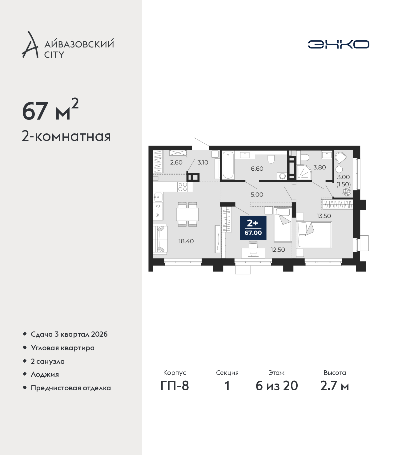 2-комн. квартира от застройщика с предчистовой отделкой в ЖК "Айвазовский City" на 6 этаже. Общая площадь: 67 кв.м., жилая: 26 кв.м., площадь просторной кухни-столовой: 18.4 кв.м. Квартира угловая, идеально подойдет любителям тишины и панорамных видов. В квартире одна лоджия, два совмещенных санузла. Высота потолков 2.7 м. Дом монолитный, многоподъездный, переменной этажности, от 14 до 24 этажей. Квартира находится в 1-й секции высотой 20 этажей в корпусе ГП-8. На этаже 6 квартир. В подъезде 1 пассажирский и 1 грузовой лифт. Окончание строительства - 3 квартал 2026 года. Оформление сделки по договору долевого участия. Новый жилой район располагается в живописном месте на берегу Туры в центральной части города. Принципиально новое пространство для жизни в центре современного города для тех, чьи мечты сбываются, кто нацелен на постоянный рост, перемены к лучшему для себя и своих близких. Каждая деталь Айвазовский City вдохновляет и заряжает на новые свершения: авторская архитектура, сбалансированная продуманная инфраструктура, дизайнерские дворы со спортивными и детскими площадками, парковые зоны с фонтанами, водный канал, украшающий центральный прогулочный маршрут района и многое другое. В 2019 года проект стал лауреатом престижной премии Urban Awards 2019 в номинации «Лучший строящийся региональный жилой комплекс бизнес-класса». Главная особенность Айвазовский City - соседство разных архитектурных школ в рамках одного дома. Изысканная классика, выразительная эклектика и оригинальный модерн - жить в одном из таких домов настоящий повод для гордости. Айвазовский City это идеальное сочетание комфорта, технологий и развитой инфраструктуры. Вход в подъезд возможен с улицы и со двора. Отправляясь на работу или за покупками, жители могут выйти с внешней стороны дома, а для прогулки с ребенком – со стороны двора. Экологически чистые материалы и энергосберегающие технологии, качественное освещение общественных зон, видеонаблюдение по всей территории жилого района (в том числе в подъездах, лифтах и в подземном паркинге), закрытые дворы с доступом только для жителей Айвазовский City. Часть домов в Айвазовский City будут оснащены подземным паркингом. Востребованный в нашем климатическом поясе формат хранения автомобилей защитит собственность владельца в любое время года. Аккредитация в банках: ПАО Банк «ВТБ», «Сбербанк России», ОАО «Альфа-Банк», ПАО «Газпромбанк», ПАО Банк «ФК Открытие» и других. (AQID02501205)