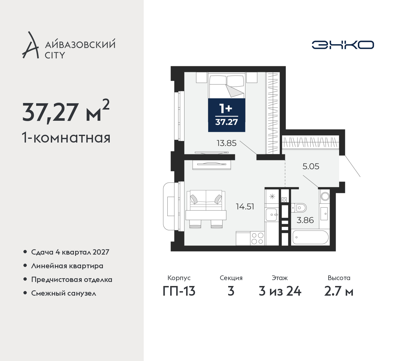 Продается однокомнатная квартира с предчистовой отделкой в ЖК "Айвазовский City" на 3 этаже. Общая площадь: 37.27 кв.м., жилая: 13.85 кв.м., площадь просторной кухни-столовой: 14.51 кв.м. Все окна выходят на одну сторону. В квартире один совмещенный санузел. Высота потолков 2.7 м. Дом монолитный, многоподъездный, высотой 24 этажа. Квартира находится в 3-й секции в корпусе ГП-13. На этаже 9 квартир. В подъезде 1 пассажирский и 1 грузовой лифт. Окончание строительства - 4 квартал 2027 года. Оформление сделки по договору долевого участия. Новый жилой район располагается в живописном месте на берегу Туры в центральной части города. Принципиально новое пространство для жизни в центре современного города для тех, чьи мечты сбываются, кто нацелен на постоянный рост, перемены к лучшему для себя и своих близких. Каждая деталь Айвазовский City вдохновляет и заряжает на новые свершения: авторская архитектура, сбалансированная продуманная инфраструктура, дизайнерские дворы со спортивными и детскими площадками, парковые зоны с фонтанами, водный канал, украшающий центральный прогулочный маршрут района и многое другое. В 2019 года проект стал лауреатом престижной премии Urban Awards 2019 в номинации «Лучший строящийся региональный жилой комплекс бизнес-класса». Главная особенность Айвазовский City - соседство разных архитектурных школ в рамках одного дома. Изысканная классика, выразительная эклектика и оригинальный модерн - жить в одном из таких домов настоящий повод для гордости. Айвазовский City это идеальное сочетание комфорта, технологий и развитой инфраструктуры. Вход в подъезд возможен с улицы и со двора. Отправляясь на работу или за покупками, жители могут выйти с внешней стороны дома, а для прогулки с ребенком – со стороны двора. Экологически чистые материалы и энергосберегающие технологии, качественное освещение общественных зон, видеонаблюдение по всей территории жилого района (в том числе в подъездах, лифтах и в подземном паркинге), закрытые дворы с доступом только для жителей Айвазовский City. Часть домов в Айвазовский City будут оснащены подземным паркингом. Востребованный в нашем климатическом поясе формат хранения автомобилей защитит собственность владельца в любое время года. Аккредитация в банках: ОАО «Альфа-Банк», «Сбербанк России», ПАО «Газпромбанк», ПАО Банк «ВТБ», ПАО Банк «ФК Открытие» и других. (AQID02521043)