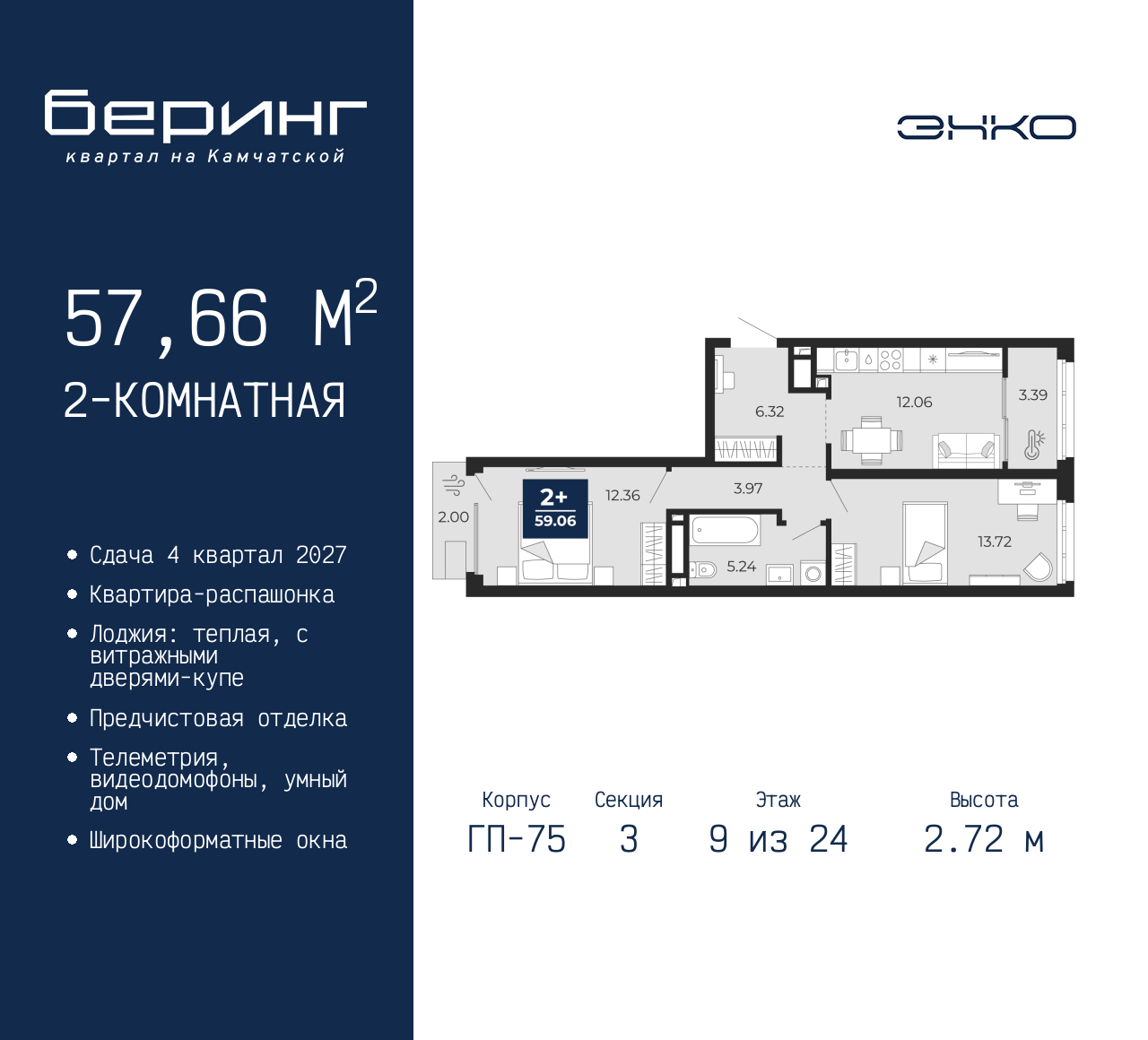 - Общая площадь 57.66 м²
