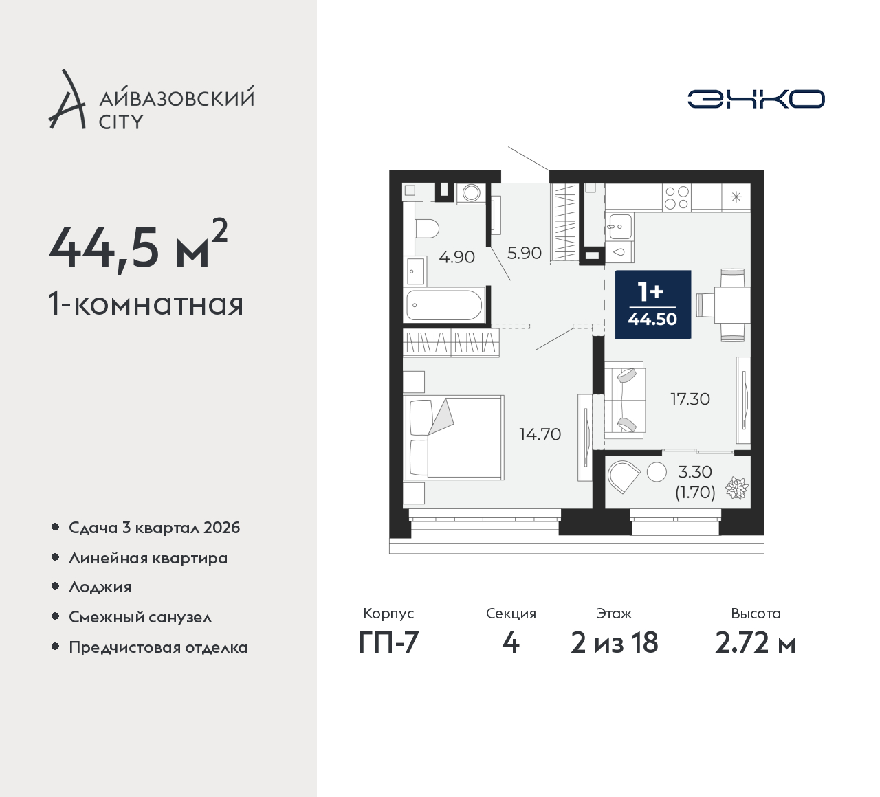 Просторная 1-комн. квартира с предчистовой отделкой в ЖК "Айвазовский City" на 2 этаже. Общая площадь: 44.5 кв.м., жилая: 14.7 кв.м., площадь просторной кухни-столовой: 17.3 кв.м. Все окна выходят на одну сторону. В квартире одна лоджия, один совмещенный санузел. Высота потолков 2.72 м. Дом монолитный, многоподъездный, переменной этажности, от 9 до 24 этажей. Квартира находится в 4-й секции высотой 18 этажей в корпусе ГП-7. На этаже 5 квартир. В подъезде 1 пассажирский и 2 грузовых лифта. Окончание строительства - 3 квартал 2026 года. Оформление сделки по договору долевого участия. Новый жилой район располагается в живописном месте на берегу Туры в центральной части города. Принципиально новое пространство для жизни в центре современного города для тех, чьи мечты сбываются, кто нацелен на постоянный рост, перемены к лучшему для себя и своих близких. Каждая деталь Айвазовский City вдохновляет и заряжает на новые свершения: авторская архитектура, сбалансированная продуманная инфраструктура, дизайнерские дворы со спортивными и детскими площадками, парковые зоны с фонтанами, водный канал, украшающий центральный прогулочный маршрут района и многое другое. В 2019 года проект стал лауреатом престижной премии Urban Awards 2019 в номинации «Лучший строящийся региональный жилой комплекс бизнес-класса». Главная особенность Айвазовский City - соседство разных архитектурных школ в рамках одного дома. Изысканная классика, выразительная эклектика и оригинальный модерн - жить в одном из таких домов настоящий повод для гордости. Айвазовский City это идеальное сочетание комфорта, технологий и развитой инфраструктуры. Вход в подъезд возможен с улицы и со двора. Отправляясь на работу или за покупками, жители могут выйти с внешней стороны дома, а для прогулки с ребенком – со стороны двора. Экологически чистые материалы и энергосберегающие технологии, качественное освещение общественных зон, видеонаблюдение по всей территории жилого района (в том числе в подъездах, лифтах и в подземном паркинге), закрытые дворы с доступом только для жителей Айвазовский City. Часть домов в Айвазовский City будут оснащены подземным паркингом. Востребованный в нашем климатическом поясе формат хранения автомобилей защитит собственность владельца в любое время года. Аккредитация в банках: «Сбербанк России», ПАО «Газпромбанк», ПАО Банк «ВТБ», ОАО «Альфа-Банк», АО "ДОМ.РФ" и других. (AQID02343174)