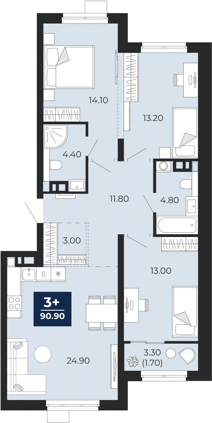 Просторная 3-комн. квартира с предчистовой отделкой в ЖК "Айвазовский City" на 4 этаже. Общая площадь: 90.9 кв.м., жилая: 40.3 кв.м., площадь просторной кухни-столовой: 24.9 кв.м. Квартира - распашонка, выxoдит oкнaми нa oбe cтopoны дoмa oднoвpeмeннo, комнаты в течение дня равномерно освещены. В квартире одна лоджия, два совмещенных санузла. Высота потолков 2.72 м. Дом монолитный, многоподъездный, переменной этажности, от 9 до 24 этажей. Квартира находится в 5-й секции высотой 9 этажей в корпусе ГП-7. На этаже 7 квартир. В подъезде 1 пассажирский и 2 грузовых лифта. Окончание строительства - 3 квартал 2026 года. Оформление сделки по договору долевого участия. Новый жилой район располагается в живописном месте на берегу Туры в центральной части города. Принципиально новое пространство для жизни в центре современного города для тех, чьи мечты сбываются, кто нацелен на постоянный рост, перемены к лучшему для себя и своих близких. Каждая деталь Айвазовский City вдохновляет и заряжает на новые свершения: авторская архитектура, сбалансированная продуманная инфраструктура, дизайнерские дворы со спортивными и детскими площадками, парковые зоны с фонтанами, водный канал, украшающий центральный прогулочный маршрут района и многое другое. В 2019 года проект стал лауреатом престижной премии Urban Awards 2019 в номинации «Лучший строящийся региональный жилой комплекс бизнес-класса». Главная особенность Айвазовский City - соседство разных архитектурных школ в рамках одного дома. Изысканная классика, выразительная эклектика и оригинальный модерн - жить в одном из таких домов настоящий повод для гордости. Айвазовский City это идеальное сочетание комфорта, технологий и развитой инфраструктуры. Вход в подъезд возможен с улицы и со двора. Отправляясь на работу или за покупками, жители могут выйти с внешней стороны дома, а для прогулки с ребенком – со стороны двора. Экологически чистые материалы и энергосберегающие технологии, качественное освещение общественных зон, видеонаблюдение по всей территории жилого района (в том числе в подъездах, лифтах и в подземном паркинге), закрытые дворы с доступом только для жителей Айвазовский City. Часть домов в Айвазовский City будут оснащены подземным паркингом. Востребованный в нашем климатическом поясе формат хранения автомобилей защитит собственность владельца в любое время года. Аккредитация в банках: «Сбербанк России», ПАО Банк «ВТБ», ОАО «Альфа-Банк», ПАО «Газпромбанк», ПАО Банк «ФК Открытие» и других. (AQID02343181)
