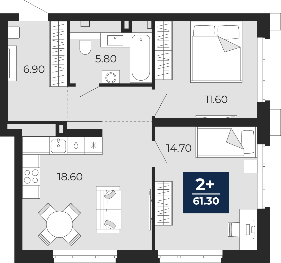 2-комн. квартира с предчистовой отделкой в ЖК "Айвазовский City" на 2 этаже. Общая площадь: 61.3 кв.м., жилая: 26.3 кв.м., площадь просторной кухни-столовой: 18.6 кв.м. Угловая квартира, очень светлая, естественная вентиляция при открытии окон. В квартире один совмещенный санузел. Высота потолков 2.7 м. Дом монолитный, многоподъездный, переменной этажности, от 14 до 24 этажей. Квартира находится в 4-й секции высотой 18 этажей в корпусе ГП-8. На этаже 6 квартир. В подъезде 1 пассажирский и 1 грузовой лифт. Окончание строительства - 3 квартал 2026 года. Оформление сделки по договору долевого участия. Новый жилой район располагается в живописном месте на берегу Туры в центральной части города. Принципиально новое пространство для жизни в центре современного города для тех, чьи мечты сбываются, кто нацелен на постоянный рост, перемены к лучшему для себя и своих близких. Каждая деталь Айвазовский City вдохновляет и заряжает на новые свершения: авторская архитектура, сбалансированная продуманная инфраструктура, дизайнерские дворы со спортивными и детскими площадками, парковые зоны с фонтанами, водный канал, украшающий центральный прогулочный маршрут района и многое другое. В 2019 года проект стал лауреатом престижной премии Urban Awards 2019 в номинации «Лучший строящийся региональный жилой комплекс бизнес-класса». Главная особенность Айвазовский City - соседство разных архитектурных школ в рамках одного дома. Изысканная классика, выразительная эклектика и оригинальный модерн - жить в одном из таких домов настоящий повод для гордости. Айвазовский City это идеальное сочетание комфорта, технологий и развитой инфраструктуры. Вход в подъезд возможен с улицы и со двора. Отправляясь на работу или за покупками, жители могут выйти с внешней стороны дома, а для прогулки с ребенком – со стороны двора. Экологически чистые материалы и энергосберегающие технологии, качественное освещение общественных зон, видеонаблюдение по всей территории жилого района (в том числе в подъездах, лифтах и в подземном паркинге), закрытые дворы с доступом только для жителей Айвазовский City. Часть домов в Айвазовский City будут оснащены подземным паркингом. Востребованный в нашем климатическом поясе формат хранения автомобилей защитит собственность владельца в любое время года. Аккредитация в банках: ПАО «Газпромбанк», «Сбербанк России», ОАО «Альфа-Банк», ПАО Банк «ВТБ», ПАО «Промсвязьбанк» и других. (AQID02453753)