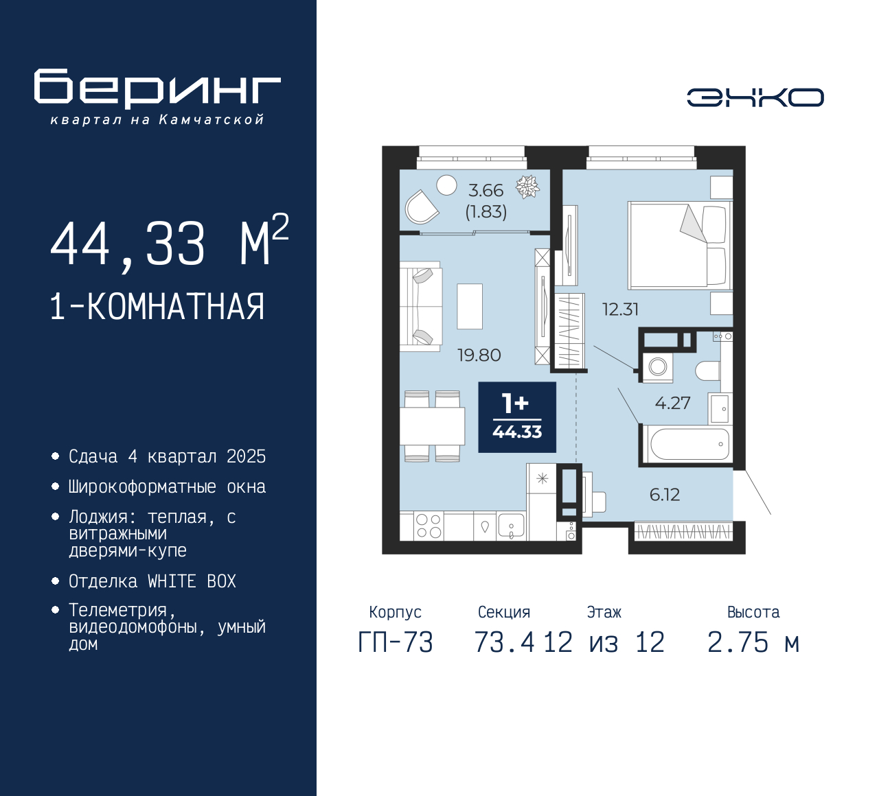 Продается однокомнатная квартира в ЖК "Беринг" на 12 этаже. Квартира без отделки, полностью готова к ремонту. Общая площадь: 44.33 кв.м., жилая: 12.31 кв.м., площадь просторной кухни-столовой: 19.8 кв.м. Все окна выходят на одну сторону. В квартире одна лоджия, один совмещенный санузел. Высота потолков 2.75 м. Дом монолитный, многоподъездный, переменной этажности, от 9 до 22 этажей. Квартира находится в 73.4-й секции высотой 12 этажей в корпусе ГП-73. На этаже 8 квартир. В подъезде 1 пассажирский и 1 грузовой лифт. Окончание строительства - 4 квартал 2025 года. Оформление сделки по договору долевого участия. Подобно знаменитому исследователю, мы чувствуем себя первооткрывателями этой локации. Хотим показать новую суть места, сформировать для вас жизненный опыт, которого ещё не было. Беринг — район зелёного цвета. Беринг — район, который откроется вам с другой стороны. Впечатлит новым уровнем комфорта и качеством жизни. Беринг — открытие на карте города. Первый квартал расположен в районе Тура, в границах улиц: Камчатская – Западносибирская – Энтузиастов. Вокруг уже есть всё для того, чтобы ежедневная рутина была лишь частью жизни и не доставляла дискомфорта. Школы и детские сады, магазины и аптеки, поликлиника, места для семейного отдыха, пеших и велопрогулок, и даже рыбалки. Масштабное озеленение дворов — визитная карточка ЭНКО и ваш оазис спокойствия, чтобы отвлечься от повседневности. Раскидистые деревья, кустарники, травы и цветы — осталось остановиться, вдохнуть и расслабиться, глядя на эту природную красоту. Стилистика подъездов продолжает концепцию Беринга, вдохновлённого Камчаткой: сдержанный, но при этом впечатляющий дизайн соседствует с удобством и функциональностью. (AQID02497860)