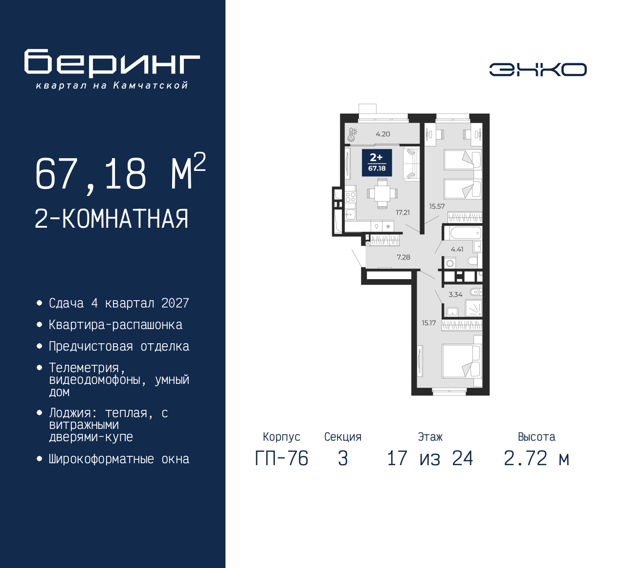 2-комн. квартира с предчистовой отделкой в ЖК "Беринг" на 17 этаже. Общая площадь: 67.18 кв.м., жилая: 30.74 кв.м., площадь просторной кухни-столовой: 17.21 кв.м. Квартира - распашонка, без проходных комнат, окна выходят на paзные стороны дома. В квартире одна лоджия, два совмещенных санузла. Высота потолков 2.72 м. Дом монолитный, черырехподъездный, переменной этажности, от 19 до 24 этажей. Квартира находится в 3-й секции высотой 24 этажа в корпусе ГП-76. На этаже 6 квартир. В подъезде 1 пассажирский и 1 грузовой лифт. Окончание строительства - 4 квартал 2027 года. Оформление сделки по договору долевого участия. Подобно знаменитому исследователю, мы чувствуем себя первооткрывателями этой локации. Хотим показать новую суть места, сформировать для вас жизненный опыт, которого ещё не было. Беринг — район зелёного цвета. Беринг — район, который откроется вам с другой стороны. Впечатлит новым уровнем комфорта и качеством жизни. Беринг — открытие на карте города. Первый квартал расположен в районе Тура, в границах улиц: Камчатская – Западносибирская – Энтузиастов. Вокруг уже есть всё для того, чтобы ежедневная рутина была лишь частью жизни и не доставляла дискомфорта. Школы и детские сады, магазины и аптеки, поликлиника, места для семейного отдыха, пеших и велопрогулок, и даже рыбалки. Масштабное озеленение дворов — визитная карточка ЭНКО и ваш оазис спокойствия, чтобы отвлечься от повседневности. Раскидистые деревья, кустарники, травы и цветы — осталось остановиться, вдохнуть и расслабиться, глядя на эту природную красоту. Стилистика подъездов продолжает концепцию Беринга, вдохновлённого Камчаткой: сдержанный, но при этом впечатляющий дизайн соседствует с удобством и функциональностью. (AQID02529325)