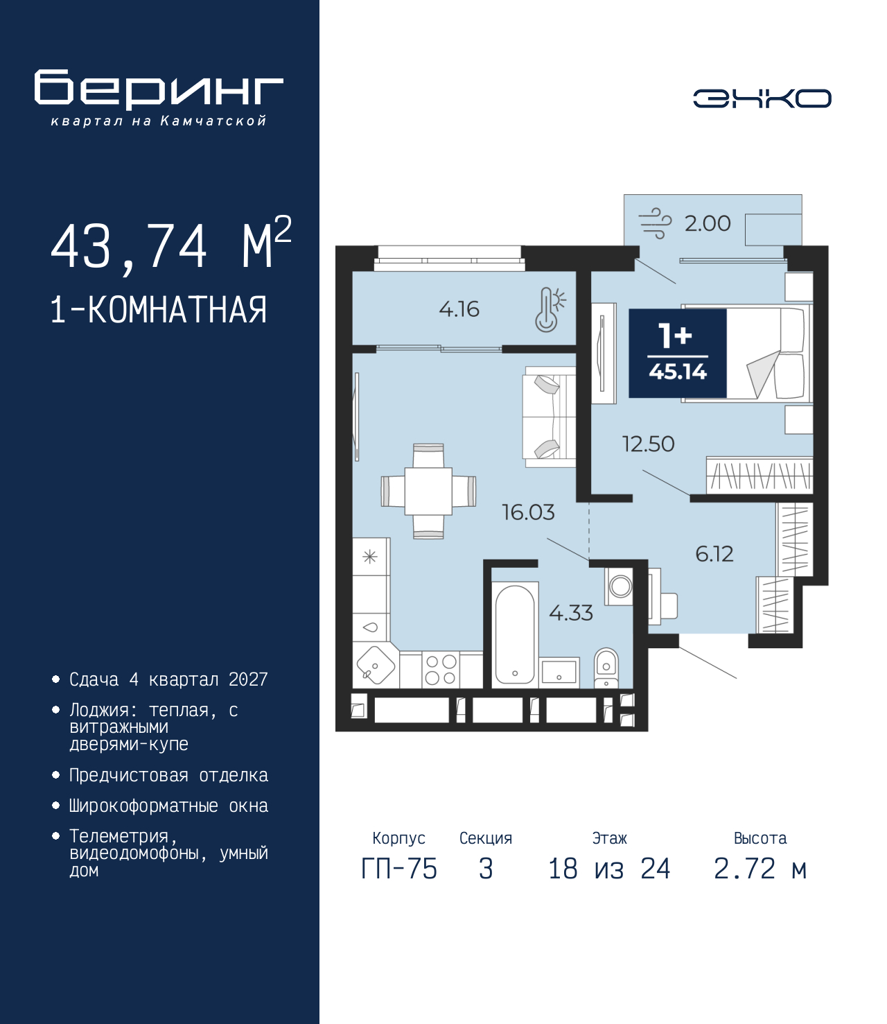 1-комн. квартира с предчистовой отделкой в ЖК "Беринг" на 18 этаже. Общая площадь: 43.74 кв.м., жилая: 12.5 кв.м., площадь просторной кухни-столовой: 16.03 кв.м. Все окна выходят на одну сторону. В квартире один балкон и одна лоджия, один совмещенный санузел. Высота потолков 2.72 м. Дом монолитный, многоподъездный, переменной этажности, от 17 до 24 этажей. Квартира находится в 3-й секции высотой 24 этажа в корпусе ГП-75. На этаже 6 квартир. В подъезде 2 пассажирских и 1 грузовой лифт. Окончание строительства - 4 квартал 2027 года. Оформление сделки по договору долевого участия. Подобно знаменитому исследователю, мы чувствуем себя первооткрывателями этой локации. Хотим показать новую суть места, сформировать для вас жизненный опыт, которого ещё не было. Беринг — район зелёного цвета. Беринг — район, который откроется вам с другой стороны. Впечатлит новым уровнем комфорта и качеством жизни. Беринг — открытие на карте города. Первый квартал расположен в районе Тура, в границах улиц: Камчатская – Западносибирская – Энтузиастов. Вокруг уже есть всё для того, чтобы ежедневная рутина была лишь частью жизни и не доставляла дискомфорта. Школы и детские сады, магазины и аптеки, поликлиника, места для семейного отдыха, пеших и велопрогулок, и даже рыбалки. Масштабное озеленение дворов — визитная карточка ЭНКО и ваш оазис спокойствия, чтобы отвлечься от повседневности. Раскидистые деревья, кустарники, травы и цветы — осталось остановиться, вдохнуть и расслабиться, глядя на эту природную красоту. Стилистика подъездов продолжает концепцию Беринга, вдохновлённого Камчаткой: сдержанный, но при этом впечатляющий дизайн соседствует с удобством и функциональностью. (AQID02529637)