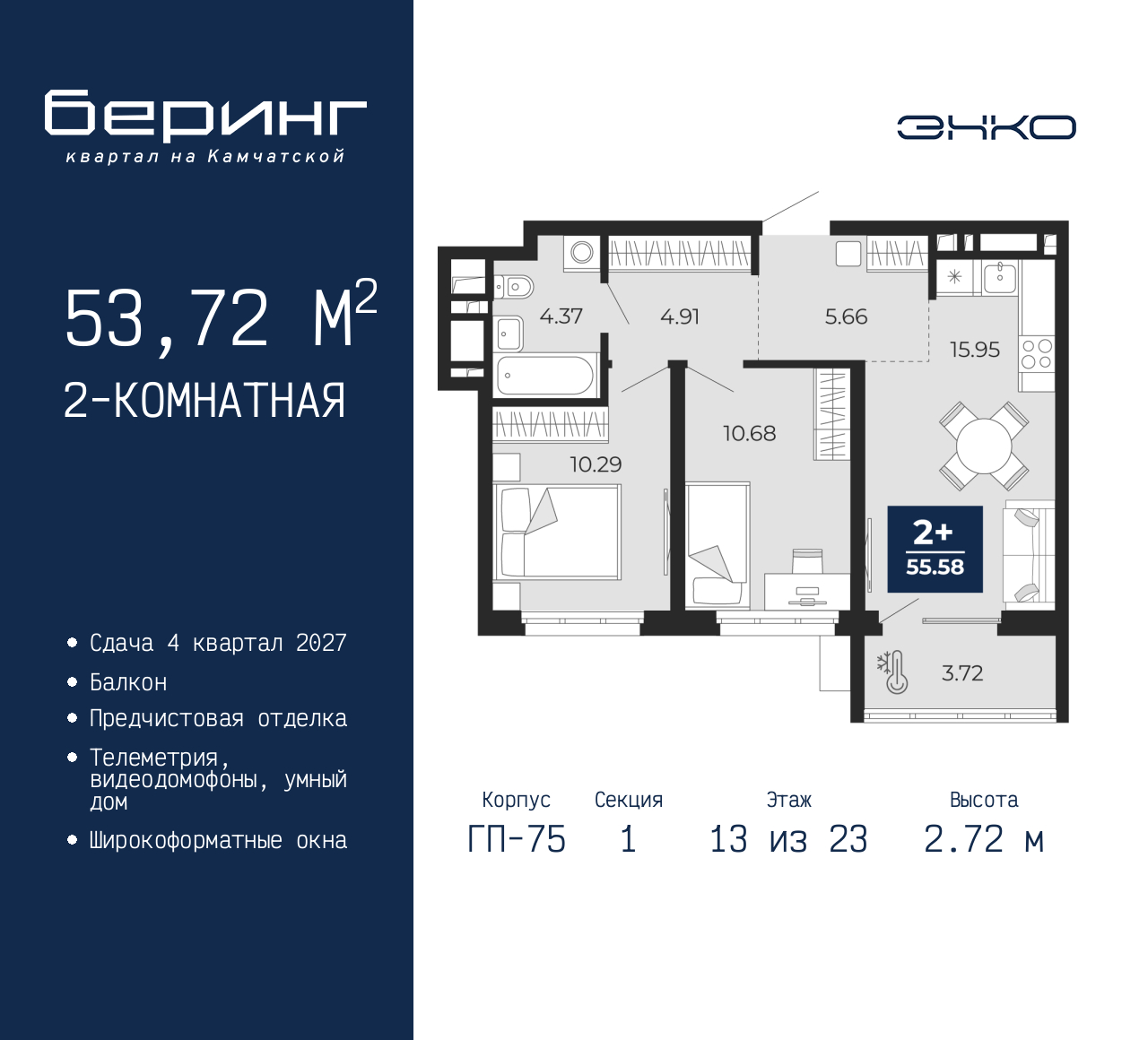 Двухкомнатная квартира с предчистовой отделкой в ЖК "Беринг" на 13 этаже. Общая площадь: 53.72 кв.м., жилая: 20.97 кв.м., площадь просторной кухни-столовой: 15.95 кв.м. Комнаты изолированные, все окна выходят на одну сторону. В квартире один балкон, один совмещенный санузел. Высота потолков 2.72 м. Дом монолитный, многоподъездный, переменной этажности, от 17 до 24 этажей. Квартира находится в 1-й секции высотой 23 этажа в корпусе ГП-75. На этаже 8 квартир. В подъезде 2 пассажирских и 1 грузовой лифт. Окончание строительства - 4 квартал 2027 года. Оформление сделки по договору долевого участия. Подобно знаменитому исследователю, мы чувствуем себя первооткрывателями этой локации. Хотим показать новую суть места, сформировать для вас жизненный опыт, которого ещё не было. Беринг — район зелёного цвета. Беринг — район, который откроется вам с другой стороны. Впечатлит новым уровнем комфорта и качеством жизни. Беринг — открытие на карте города. Первый квартал расположен в районе Тура, в границах улиц: Камчатская – Западносибирская – Энтузиастов. Вокруг уже есть всё для того, чтобы ежедневная рутина была лишь частью жизни и не доставляла дискомфорта. Школы и детские сады, магазины и аптеки, поликлиника, места для семейного отдыха, пеших и велопрогулок, и даже рыбалки. Масштабное озеленение дворов — визитная карточка ЭНКО и ваш оазис спокойствия, чтобы отвлечься от повседневности. Раскидистые деревья, кустарники, травы и цветы — осталось остановиться, вдохнуть и расслабиться, глядя на эту природную красоту. Стилистика подъездов продолжает концепцию Беринга, вдохновлённого Камчаткой: сдержанный, но при этом впечатляющий дизайн соседствует с удобством и функциональностью. (AQID02529668)