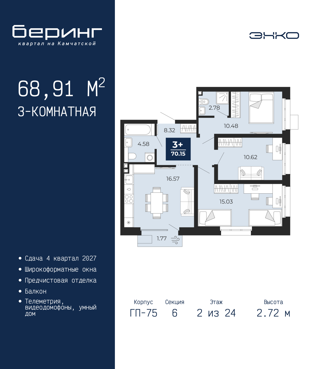 - Общая площадь 68.91 м²