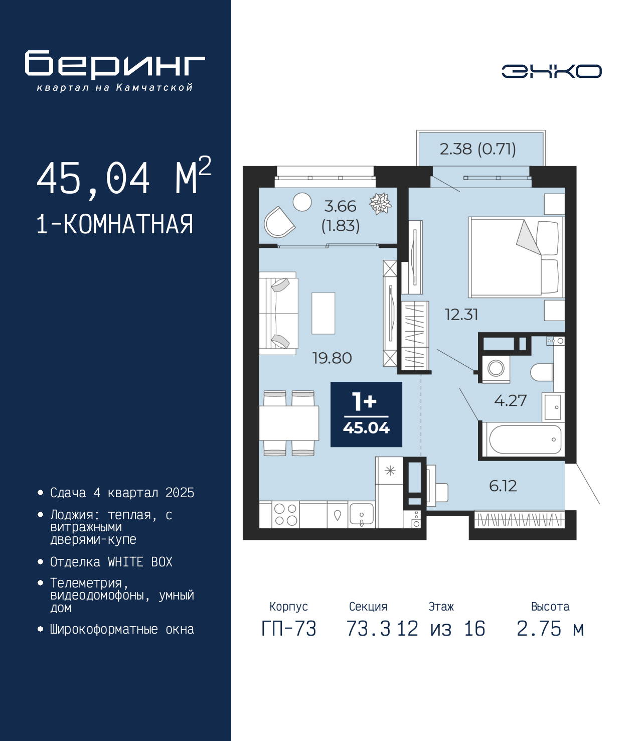 Продается 1-комн. квартира в ЖК "Беринг" на 12 этаже. Квартира без отделки, новый владелец может сделать ремонт по индивидуальному дизайн-проекту. Общая площадь: 45.04 кв.м., жилая: 12.31 кв.м., площадь просторной кухни-столовой: 19.8 кв.м. Все окна выходят на одну сторону. В квартире один балкон и одна лоджия, один совмещенный санузел. Высота потолков 2.75 м. Дом монолитный, многоподъездный, переменной этажности, от 9 до 22 этажей. Квартира находится в 73.3-й секции высотой 16 этажей в корпусе ГП-73. На этаже 8 квартир. В подъезде 1 пассажирский и 1 грузовой лифт. Окончание строительства - 4 квартал 2025 года. Оформление сделки по договору долевого участия. Подобно знаменитому исследователю, мы чувствуем себя первооткрывателями этой локации. Хотим показать новую суть места, сформировать для вас жизненный опыт, которого ещё не было. Беринг — район зелёного цвета. Беринг — район, который откроется вам с другой стороны. Впечатлит новым уровнем комфорта и качеством жизни. Беринг — открытие на карте города. Первый квартал расположен в районе Тура, в границах улиц: Камчатская – Западносибирская – Энтузиастов. Вокруг уже есть всё для того, чтобы ежедневная рутина была лишь частью жизни и не доставляла дискомфорта. Школы и детские сады, магазины и аптеки, поликлиника, места для семейного отдыха, пеших и велопрогулок, и даже рыбалки. Масштабное озеленение дворов — визитная карточка ЭНКО и ваш оазис спокойствия, чтобы отвлечься от повседневности. Раскидистые деревья, кустарники, травы и цветы — осталось остановиться, вдохнуть и расслабиться, глядя на эту природную красоту. Стилистика подъездов продолжает концепцию Беринга, вдохновлённого Камчаткой: сдержанный, но при этом впечатляющий дизайн соседствует с удобством и функциональностью. (AQID02529857)