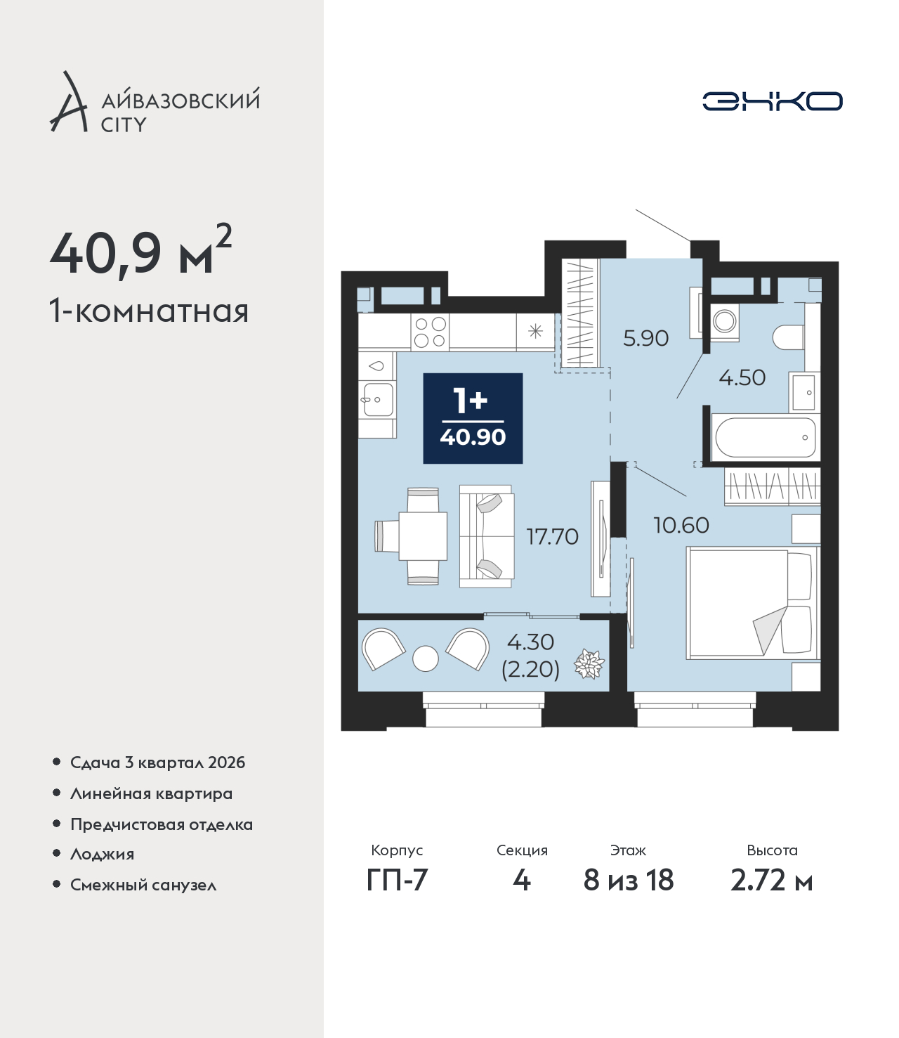- Общая площадь 40.9 м²