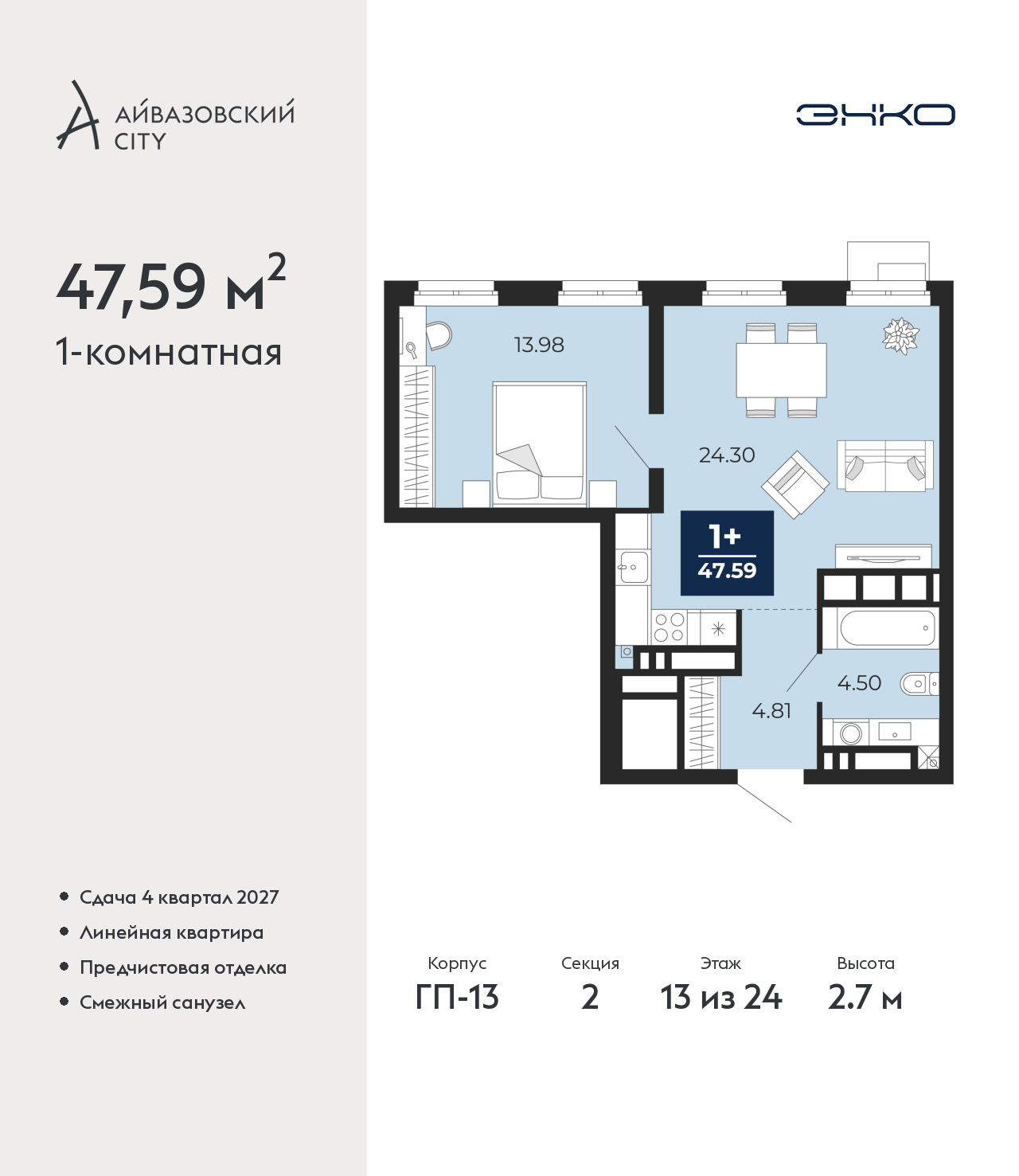 Однокомнатная квартира от застройщика с предчистовой отделкой в ЖК "Айвазовский City" на 13 этаже. Общая площадь: 47.59 кв.м., жилая: 13.98 кв.м., площадь просторной кухни-столовой: 24.3 кв.м. Все окна выходят на одну сторону. В квартире один совмещенный санузел. Высота потолков 2.7 м. Дом монолитный, многоподъездный, высотой 24 этажа. Квартира находится во 2-й секции в корпусе ГП-13. На этаже 6 квартир. В подъезде 1 пассажирский и 1 грузовой лифт. Окончание строительства - 4 квартал 2027 года. Оформление сделки по договору долевого участия. Новый жилой район располагается в живописном месте на берегу Туры в центральной части города. Принципиально новое пространство для жизни в центре современного города для тех, чьи мечты сбываются, кто нацелен на постоянный рост, перемены к лучшему для себя и своих близких. Каждая деталь Айвазовский City вдохновляет и заряжает на новые свершения: авторская архитектура, сбалансированная продуманная инфраструктура, дизайнерские дворы со спортивными и детскими площадками, парковые зоны с фонтанами, водный канал, украшающий центральный прогулочный маршрут района и многое другое. В 2019 года проект стал лауреатом престижной премии Urban Awards 2019 в номинации «Лучший строящийся региональный жилой комплекс бизнес-класса». Главная особенность Айвазовский City - соседство разных архитектурных школ в рамках одного дома. Изысканная классика, выразительная эклектика и оригинальный модерн - жить в одном из таких домов настоящий повод для гордости. Айвазовский City это идеальное сочетание комфорта, технологий и развитой инфраструктуры. Вход в подъезд возможен с улицы и со двора. Отправляясь на работу или за покупками, жители могут выйти с внешней стороны дома, а для прогулки с ребенком – со стороны двора. Экологически чистые материалы и энергосберегающие технологии, качественное освещение общественных зон, видеонаблюдение по всей территории жилого района (в том числе в подъездах, лифтах и в подземном паркинге), закрытые дворы с доступом только для жителей Айвазовский City. Часть домов в Айвазовский City будут оснащены подземным паркингом. Востребованный в нашем климатическом поясе формат хранения автомобилей защитит собственность владельца в любое время года. Аккредитация в банках: ОАО «Альфа-Банк», ПАО Банк «ВТБ», «Сбербанк России», ПАО «Газпромбанк», ПАО АКБ «Абсолют Банк» и других. (AQID02525637)