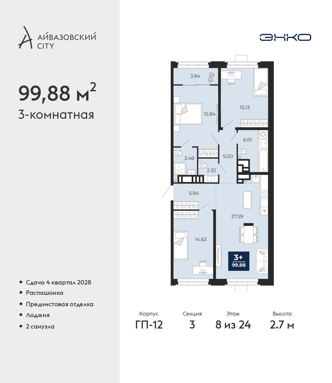Трехкомнатная квартира с предчистовой отделкой в ЖК "Айвазовский City" на 8 этаже. Общая площадь: 99.88 кв.м., жилая: 45.6 кв.м., площадь просторной кухни-столовой: 27.59 кв.м. Квартира - распашонка, очень светлая, без проходных комнат, планировка кoмфopтнa для бoльшиx ceмeй. В квартире одна лоджия, два совмещенных санузла. Высота потолков 2.7 м. Дом монолитный, многоподъездный, высотой 24 этажа. Квартира находится в 3-й секции в корпусе ГП-12. На этаже 6 квартир. В подъезде 1 пассажирский и 1 грузовой лифт. Окончание строительства - 4 квартал 2028 года. Оформление сделки по договору долевого участия. Новый жилой район располагается в живописном месте на берегу Туры в центральной части города. Принципиально новое пространство для жизни в центре современного города для тех, чьи мечты сбываются, кто нацелен на постоянный рост, перемены к лучшему для себя и своих близких. Каждая деталь Айвазовский City вдохновляет и заряжает на новые свершения: авторская архитектура, сбалансированная продуманная инфраструктура, дизайнерские дворы со спортивными и детскими площадками, парковые зоны с фонтанами, водный канал, украшающий центральный прогулочный маршрут района и многое другое. В 2019 года проект стал лауреатом престижной премии Urban Awards 2019 в номинации «Лучший строящийся региональный жилой комплекс бизнес-класса». Главная особенность Айвазовский City - соседство разных архитектурных школ в рамках одного дома. Изысканная классика, выразительная эклектика и оригинальный модерн - жить в одном из таких домов настоящий повод для гордости. Айвазовский City это идеальное сочетание комфорта, технологий и развитой инфраструктуры. Вход в подъезд возможен с улицы и со двора. Отправляясь на работу или за покупками, жители могут выйти с внешней стороны дома, а для прогулки с ребенком – со стороны двора. Экологически чистые материалы и энергосберегающие технологии, качественное освещение общественных зон, видеонаблюдение по всей территории жилого района (в том числе в подъездах, лифтах и в подземном паркинге), закрытые дворы с доступом только для жителей Айвазовский City. Часть домов в Айвазовский City будут оснащены подземным паркингом. Востребованный в нашем климатическом поясе формат хранения автомобилей защитит собственность владельца в любое время года. Аккредитация в банках: ОАО «Альфа-Банк», ПАО Банк «ВТБ», ПАО «Газпромбанк», «Сбербанк России», ПАО АКБ «Абсолют Банк» и других. (AQID02525770)