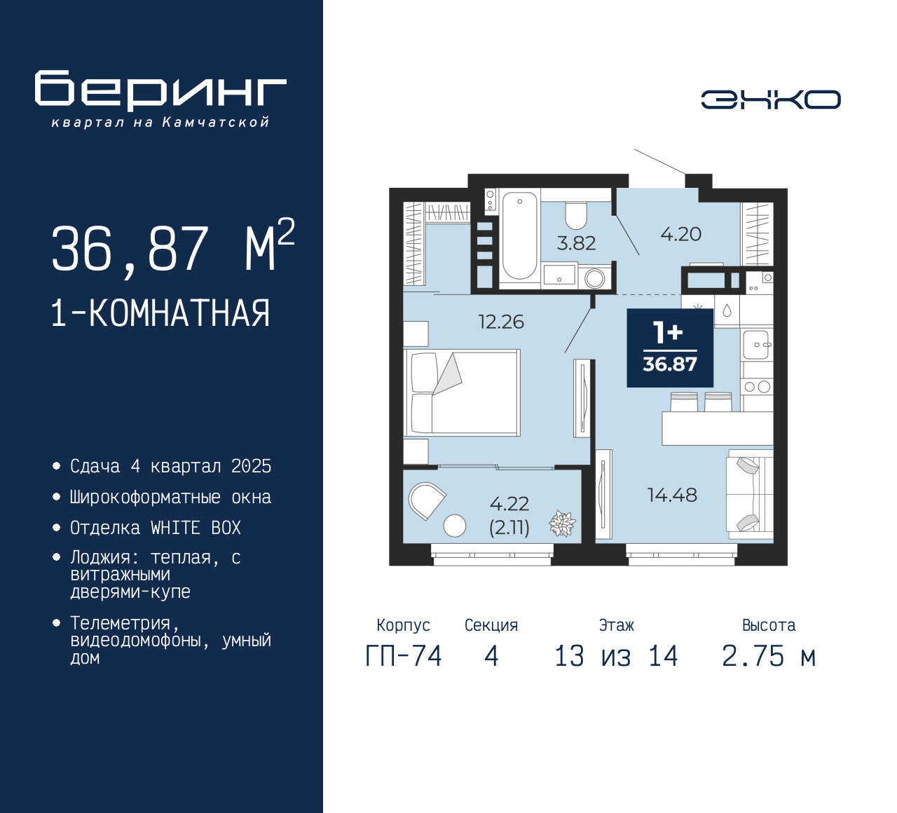 Однокомнатная квартира от застройщика в ЖК "Беринг" на 13 этаже. Квартира без отделки, новый владелец может сделать ремонт по своему дизайн-проекту. Общая площадь: 36.87 кв.м., жилая: 12.26 кв.м., площадь просторной кухни-столовой: 14.48 кв.м. Все окна выходят на одну сторону. В квартире одна лоджия, один совмещенный санузел. Высота потолков 2.75 м. Дом монолитный, многоподъездный, переменной этажности, от 9 до 21 этажей. Квартира находится в 4-й секции высотой 14 этажей в корпусе ГП-74. На этаже 7 квартир. В подъезде 1 пассажирский и 1 грузовой лифт. Окончание строительства - 4 квартал 2025 года. Оформление сделки по договору долевого участия. Подобно знаменитому исследователю, мы чувствуем себя первооткрывателями этой локации. Хотим показать новую суть места, сформировать для вас жизненный опыт, которого ещё не было. Беринг — район зелёного цвета. Беринг — район, который откроется вам с другой стороны. Впечатлит новым уровнем комфорта и качеством жизни. Беринг — открытие на карте города. Первый квартал расположен в районе Тура, в границах улиц: Камчатская – Западносибирская – Энтузиастов. Вокруг уже есть всё для того, чтобы ежедневная рутина была лишь частью жизни и не доставляла дискомфорта. Школы и детские сады, магазины и аптеки, поликлиника, места для семейного отдыха, пеших и велопрогулок, и даже рыбалки. Масштабное озеленение дворов — визитная карточка ЭНКО и ваш оазис спокойствия, чтобы отвлечься от повседневности. Раскидистые деревья, кустарники, травы и цветы — осталось остановиться, вдохнуть и расслабиться, глядя на эту природную красоту. Стилистика подъездов продолжает концепцию Беринга, вдохновлённого Камчаткой: сдержанный, но при этом впечатляющий дизайн соседствует с удобством и функциональностью. (AQID02315610)