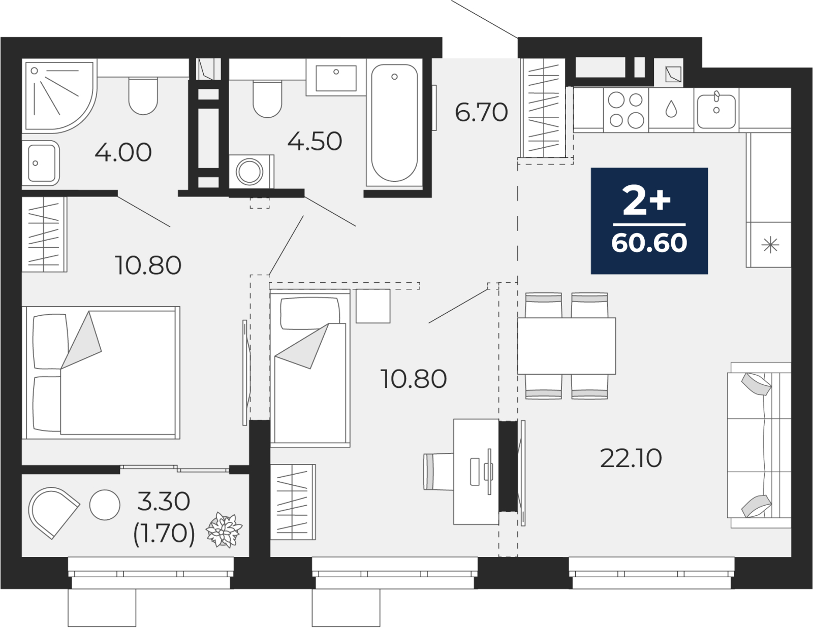 - Общая площадь 60.6 м²