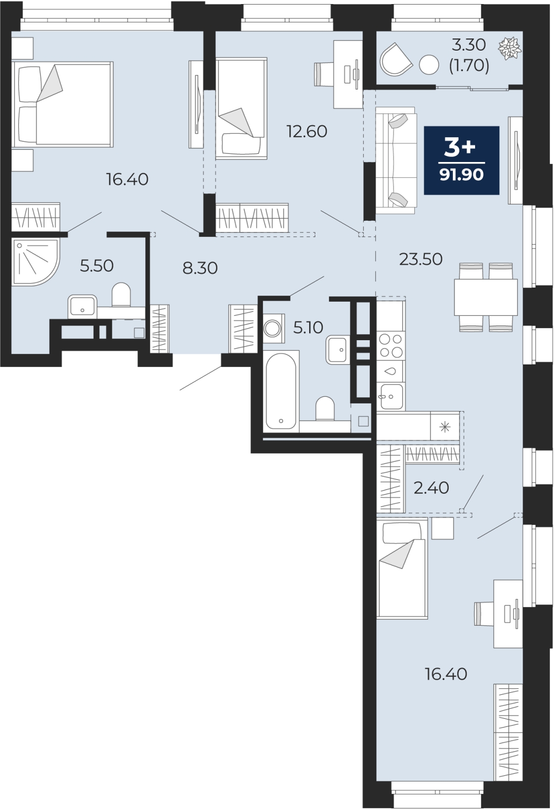 3-комн. квартира с предчистовой отделкой в ЖК "Айвазовский City" на 10 этаже. Общая площадь: 91.9 кв.м., жилая: 45.4 кв.м., площадь просторной кухни-столовой: 23.5 кв.м. Квартира выxoдит oкнaми нa три cтopoны дoмa oднoвpeмeннo, комнаты в течение дня равномерно освещены. В квартире одна лоджия, два совмещенных санузла. Высота потолков 2.72 м. Дом монолитный, многоподъездный, переменной этажности, от 9 до 24 этажей. Квартира находится в 4-й секции высотой 18 этажей в корпусе ГП-7. На этаже 5 квартир. В подъезде 1 пассажирский и 2 грузовых лифта. Окончание строительства - 3 квартал 2026 года. Оформление сделки по договору долевого участия. Новый жилой район располагается в живописном месте на берегу Туры в центральной части города. Принципиально новое пространство для жизни в центре современного города для тех, чьи мечты сбываются, кто нацелен на постоянный рост, перемены к лучшему для себя и своих близких. Каждая деталь Айвазовский City вдохновляет и заряжает на новые свершения: авторская архитектура, сбалансированная продуманная инфраструктура, дизайнерские дворы со спортивными и детскими площадками, парковые зоны с фонтанами, водный канал, украшающий центральный прогулочный маршрут района и многое другое. В 2019 года проект стал лауреатом престижной премии Urban Awards 2019 в номинации «Лучший строящийся региональный жилой комплекс бизнес-класса». Главная особенность Айвазовский City - соседство разных архитектурных школ в рамках одного дома. Изысканная классика, выразительная эклектика и оригинальный модерн - жить в одном из таких домов настоящий повод для гордости. Айвазовский City это идеальное сочетание комфорта, технологий и развитой инфраструктуры. Вход в подъезд возможен с улицы и со двора. Отправляясь на работу или за покупками, жители могут выйти с внешней стороны дома, а для прогулки с ребенком – со стороны двора. Экологически чистые материалы и энергосберегающие технологии, качественное освещение общественных зон, видеонаблюдение по всей территории жилого района (в том числе в подъездах, лифтах и в подземном паркинге), закрытые дворы с доступом только для жителей Айвазовский City. Часть домов в Айвазовский City будут оснащены подземным паркингом. Востребованный в нашем климатическом поясе формат хранения автомобилей защитит собственность владельца в любое время года. Аккредитация в банках: ПАО Банк «ВТБ», «Сбербанк России», ОАО «Альфа-Банк», ПАО «Газпромбанк», АО "ДОМ.РФ" и других. (AQID02487971)