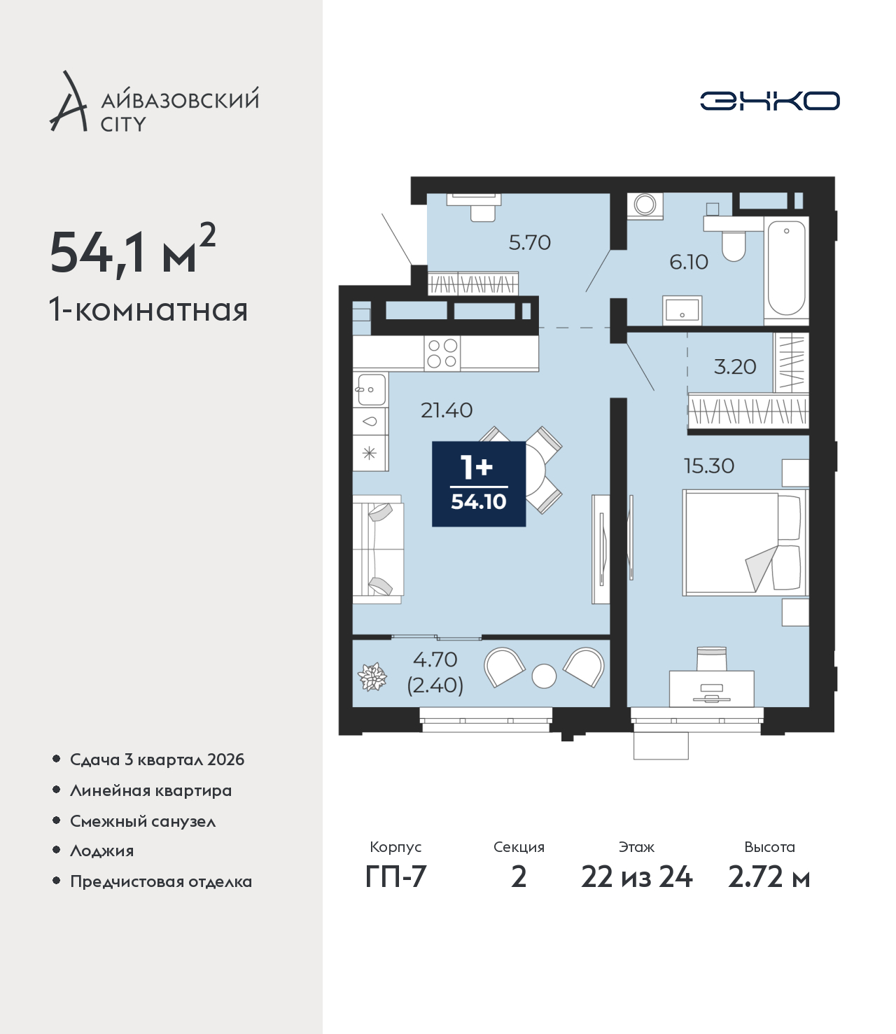 - Общая площадь 54.1 м²