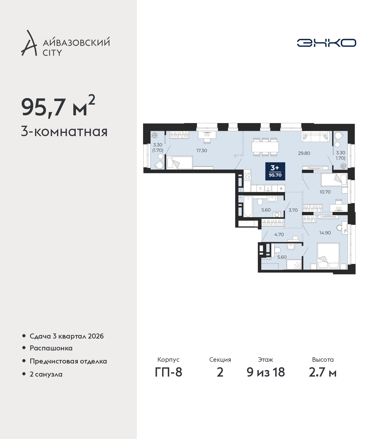- Общая площадь 95.7 м²
