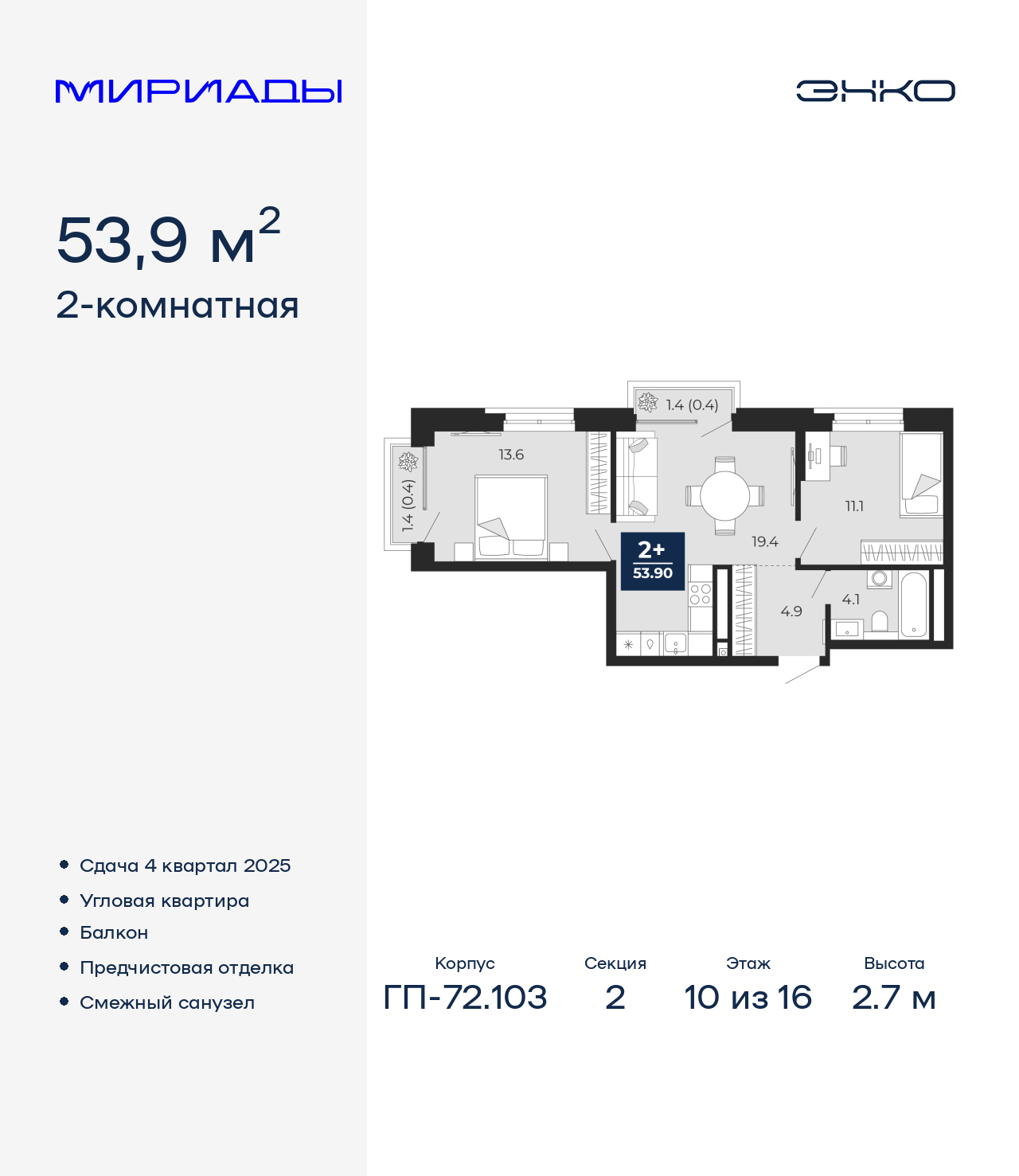 2-комн. квартира от застройщика с предчистовой отделкой в ЖК "Мириады" на 10 этаже. Общая площадь: 53.9 кв.м., жилая: 24.7 кв.м., площадь просторной кухни-столовой: 19.4 кв.м. Квартира угловая, очень светлая, естественная вентиляция при открытии окон. В квартире два балкона, один совмещенный санузел. Высота потолков 2.7 м. Дом монолитный, трехподъездный, переменной этажности, от 14 до 16 этажей. Квартира находится во 2-й секции высотой 16 этажей в корпусе ГП-72.103. На этаже 6 квартир. В подъезде 1 пассажирский и 1 грузовой лифт. Окончание строительства - 4 квартал 2025 года. Оформление сделки по договору долевого участия. Вселенная бесконечных историй. Ранее невиданный Тюмени масштаб: территория 240 гектаров и 1 650 000 м² застройки. Мириады – это город масштабных перемен и больших возможностей. Город зеленых рощ и зеркальных озер. Город для работы, учебы и развлечений. Город для детей и их родителей. Город для всех и каждого. Проект расположен в районе Мыс рядом с ТРЦ «Тюмень Сити Молл» в границах улицы Тимофея Чаркова, Тобольского тракта и объездной дороги. Срок полного освоения территории - до 2034 года. (AQID02525019)
