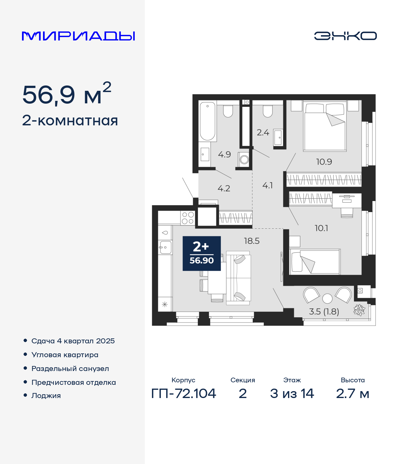 Продается 2-комн. квартира от застройщика с предчистовой отделкой в ЖК "Мириады" на 3 этаже. Общая площадь: 56.9 кв.м., жилая: 21 кв.м., площадь просторной кухни-столовой: 18.5 кв.м. Угловая квартира, идеально подойдет любителям тишины и панорамных видов. В квартире одна лоджия, один раздельный санузел. Высота потолков 2.7 м. Дом монолитный, двухподъездный, переменной этажности, от 14 до 18 этажей. Квартира находится во 2-й секции высотой 14 этажей в корпусе ГП-72.104. На этаже 8 квартир. В подъезде 1 пассажирский и 1 грузовой лифт. Окончание строительства - 4 квартал 2025 года. Оформление сделки по договору долевого участия. Вселенная бесконечных историй. Ранее невиданный Тюмени масштаб: территория 240 гектаров и 1 650 000 м² застройки. Мириады – это город масштабных перемен и больших возможностей. Город зеленых рощ и зеркальных озер. Город для работы, учебы и развлечений. Город для детей и их родителей. Город для всех и каждого. Проект расположен в районе Мыс рядом с ТРЦ «Тюмень Сити Молл» в границах улицы Тимофея Чаркова, Тобольского тракта и объездной дороги. Срок полного освоения территории - до 2034 года. (AQID02526912)