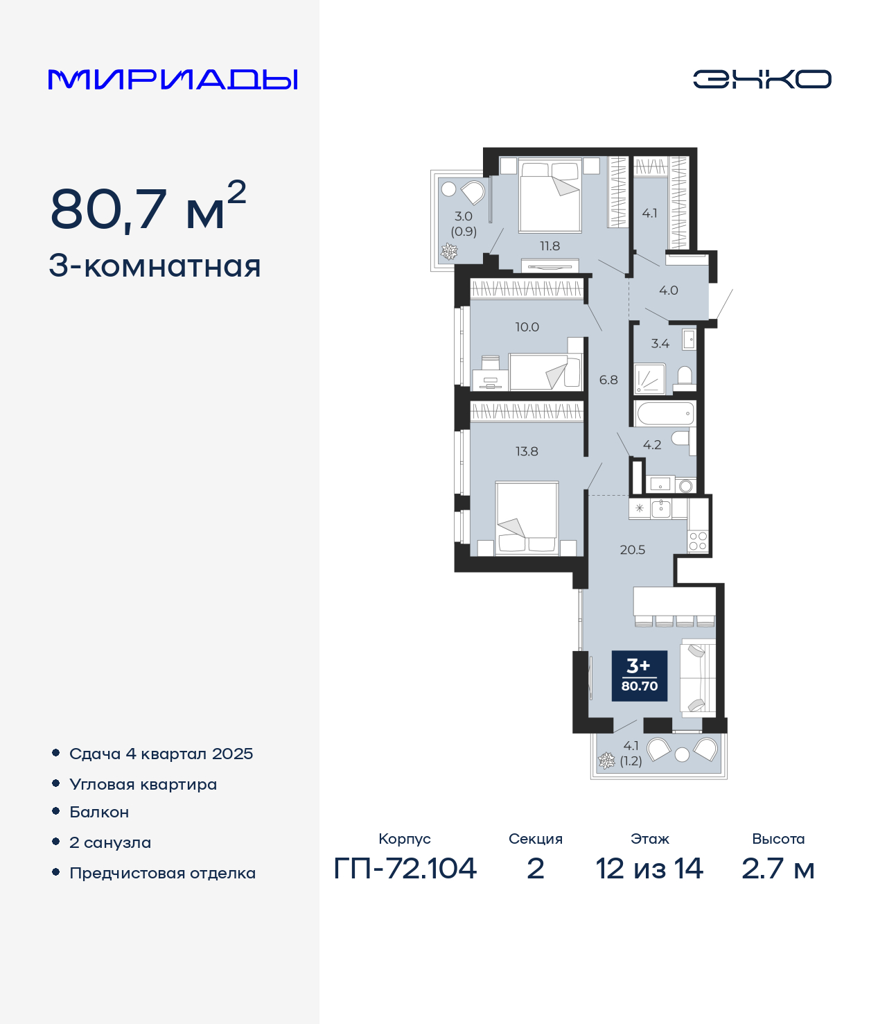 3-комн. квартира с предчистовой отделкой в ЖК "Мириады" на 12 этаже. Общая площадь: 80.7 кв.м., жилая: 35.6 кв.м., площадь просторной кухни-столовой: 20.5 кв.м. Квартира угловая, идеально подойдет любителям тишины и панорамных видов. В квартире два балкона, два совмещенных санузла. Высота потолков 2.7 м. Дом монолитный, двухподъездный, переменной этажности, от 14 до 18 этажей. Квартира находится во 2-й секции высотой 14 этажей в корпусе ГП-72.104. На этаже 8 квартир. В подъезде 1 пассажирский и 1 грузовой лифт. Окончание строительства - 4 квартал 2025 года. Оформление сделки по договору долевого участия. Вселенная бесконечных историй. Ранее невиданный Тюмени масштаб: территория 240 гектаров и 1 650 000 м² застройки. Мириады – это город масштабных перемен и больших возможностей. Город зеленых рощ и зеркальных озер. Город для работы, учебы и развлечений. Город для детей и их родителей. Город для всех и каждого. Проект расположен в районе Мыс рядом с ТРЦ «Тюмень Сити Молл» в границах улицы Тимофея Чаркова, Тобольского тракта и объездной дороги. Срок полного освоения территории - до 2034 года. (AQID02526926)