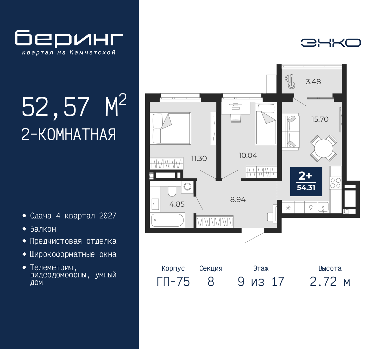 Просторная двухкомнатная квартира с предчистовой отделкой в ЖК "Беринг" на 9 этаже. Общая площадь: 52.57 кв.м., жилая: 21.34 кв.м., площадь просторной кухни-столовой: 15.7 кв.м. Комнаты изолированные, все окна выходят на одну сторону. В квартире один балкон, один совмещенный санузел. Высота потолков 2.72 м. Дом монолитный, многоподъездный, переменной этажности, от 17 до 24 этажей. Квартира находится в 8-й секции высотой 17 этажей в корпусе ГП-75. На этаже 8 квартир. В подъезде 2 пассажирских и 1 грузовой лифт. Окончание строительства - 4 квартал 2027 года. Оформление сделки по договору долевого участия. Подобно знаменитому исследователю, мы чувствуем себя первооткрывателями этой локации. Хотим показать новую суть места, сформировать для вас жизненный опыт, которого ещё не было. Беринг — район зелёного цвета. Беринг — район, который откроется вам с другой стороны. Впечатлит новым уровнем комфорта и качеством жизни. Беринг — открытие на карте города. Первый квартал расположен в районе Тура, в границах улиц: Камчатская – Западносибирская – Энтузиастов. Вокруг уже есть всё для того, чтобы ежедневная рутина была лишь частью жизни и не доставляла дискомфорта. Школы и детские сады, магазины и аптеки, поликлиника, места для семейного отдыха, пеших и велопрогулок, и даже рыбалки. Масштабное озеленение дворов — визитная карточка ЭНКО и ваш оазис спокойствия, чтобы отвлечься от повседневности. Раскидистые деревья, кустарники, травы и цветы — осталось остановиться, вдохнуть и расслабиться, глядя на эту природную красоту. Стилистика подъездов продолжает концепцию Беринга, вдохновлённого Камчаткой: сдержанный, но при этом впечатляющий дизайн соседствует с удобством и функциональностью. (AQID02529656)
