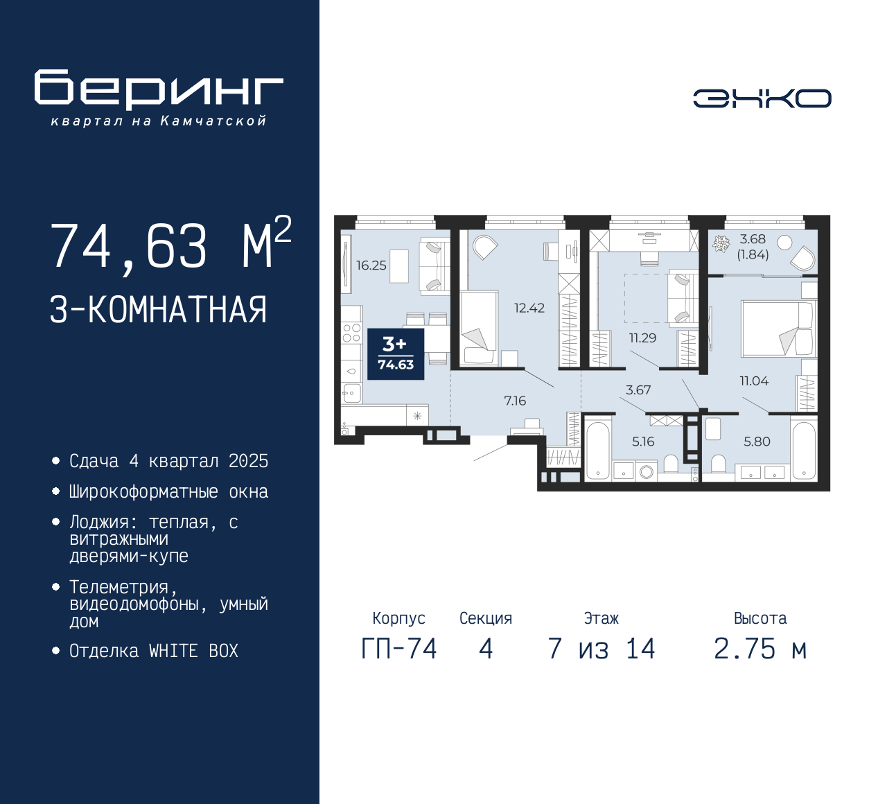 Продается 3-комн. квартира от застройщика в ЖК "Беринг" на 7 этаже. Квартира без отделки, после получения ключей можно делать ремонт. Общая площадь: 74.63 кв.м., жилая: 34.75 кв.м., площадь просторной кухни-столовой: 16.25 кв.м. Комнаты изолированные, все окна выходят на одну сторону. В квартире одна лоджия, два совмещенных санузла. Высота потолков 2.75 м. Дом монолитный, многоподъездный, переменной этажности, от 9 до 21 этажей. Квартира находится в 4-й секции высотой 14 этажей в корпусе ГП-74. На этаже 7 квартир. В подъезде 1 пассажирский и 1 грузовой лифт. Окончание строительства - 4 квартал 2025 года. Оформление сделки по договору долевого участия. Подобно знаменитому исследователю, мы чувствуем себя первооткрывателями этой локации. Хотим показать новую суть места, сформировать для вас жизненный опыт, которого ещё не было. Беринг — район зелёного цвета. Беринг — район, который откроется вам с другой стороны. Впечатлит новым уровнем комфорта и качеством жизни. Беринг — открытие на карте города. Первый квартал расположен в районе Тура, в границах улиц: Камчатская – Западносибирская – Энтузиастов. Вокруг уже есть всё для того, чтобы ежедневная рутина была лишь частью жизни и не доставляла дискомфорта. Школы и детские сады, магазины и аптеки, поликлиника, места для семейного отдыха, пеших и велопрогулок, и даже рыбалки. Масштабное озеленение дворов — визитная карточка ЭНКО и ваш оазис спокойствия, чтобы отвлечься от повседневности. Раскидистые деревья, кустарники, травы и цветы — осталось остановиться, вдохнуть и расслабиться, глядя на эту природную красоту. Стилистика подъездов продолжает концепцию Беринга, вдохновлённого Камчаткой: сдержанный, но при этом впечатляющий дизайн соседствует с удобством и функциональностью. (AQID02432105)