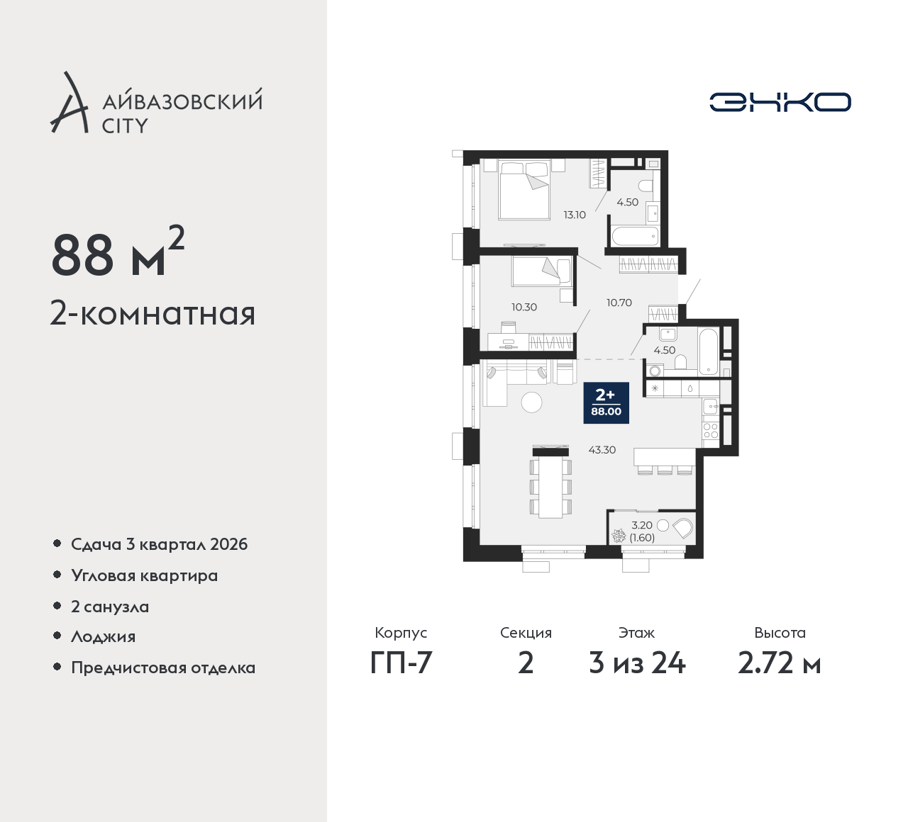 Продается двухкомнатная квартира с предчистовой отделкой в ЖК "Айвазовский City" на 3 этаже. Общая площадь: 88 кв.м., жилая: 23.4 кв.м., площадь просторной кухни-столовой: 43.3 кв.м. Угловая квартира, идеально подойдет любителям тишины и панорамных видов. В квартире одна лоджия, два совмещенных санузла. Высота потолков 2.72 м. Дом монолитный, многоподъездный, переменной этажности, от 9 до 24 этажей. Квартира находится во 2-й секции высотой 24 этажа в корпусе ГП-7. На этаже 7 квартир. В подъезде 1 пассажирский и 2 грузовых лифта. Окончание строительства - 3 квартал 2026 года. Оформление сделки по договору долевого участия. Новый жилой район располагается в живописном месте на берегу Туры в центральной части города. Принципиально новое пространство для жизни в центре современного города для тех, чьи мечты сбываются, кто нацелен на постоянный рост, перемены к лучшему для себя и своих близких. Каждая деталь Айвазовский City вдохновляет и заряжает на новые свершения: авторская архитектура, сбалансированная продуманная инфраструктура, дизайнерские дворы со спортивными и детскими площадками, парковые зоны с фонтанами, водный канал, украшающий центральный прогулочный маршрут района и многое другое. В 2019 года проект стал лауреатом престижной премии Urban Awards 2019 в номинации «Лучший строящийся региональный жилой комплекс бизнес-класса». Главная особенность Айвазовский City - соседство разных архитектурных школ в рамках одного дома. Изысканная классика, выразительная эклектика и оригинальный модерн - жить в одном из таких домов настоящий повод для гордости. Айвазовский City это идеальное сочетание комфорта, технологий и развитой инфраструктуры. Вход в подъезд возможен с улицы и со двора. Отправляясь на работу или за покупками, жители могут выйти с внешней стороны дома, а для прогулки с ребенком – со стороны двора. Экологически чистые материалы и энергосберегающие технологии, качественное освещение общественных зон, видеонаблюдение по всей территории жилого района (в том числе в подъездах, лифтах и в подземном паркинге), закрытые дворы с доступом только для жителей Айвазовский City. Часть домов в Айвазовский City будут оснащены подземным паркингом. Востребованный в нашем климатическом поясе формат хранения автомобилей защитит собственность владельца в любое время года. Аккредитация в банках: ПАО Банк «ВТБ», «Сбербанк России», ПАО «Газпромбанк», ОАО «Альфа-Банк», ПАО АКБ «Абсолют Банк» и других. (AQID02483569)