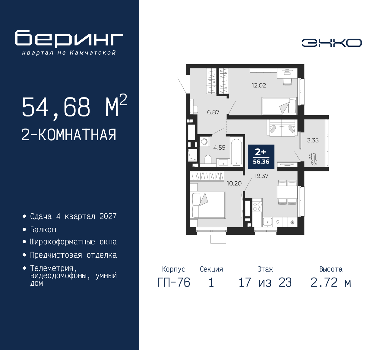 2-комн. квартира от застройщика с предчистовой отделкой в ЖК "Беринг" на 17 этаже. Общая площадь: 54.68 кв.м., жилая: 22.22 кв.м., площадь просторной кухни-столовой: 19.37 кв.м. Квартира угловая, идеально подойдет любителям тишины и панорамных видов. В квартире один балкон, один совмещенный санузел. Высота потолков 2.72 м. Дом монолитный, черырехподъездный, переменной этажности, от 19 до 24 этажей. Квартира находится в 1-й секции высотой 23 этажа в корпусе ГП-76. На этаже 7 квартир. В подъезде 2 пассажирских и 1 грузовой лифт. Окончание строительства - 4 квартал 2027 года. Оформление сделки по договору долевого участия. Подобно знаменитому исследователю, мы чувствуем себя первооткрывателями этой локации. Хотим показать новую суть места, сформировать для вас жизненный опыт, которого ещё не было. Беринг — район зелёного цвета. Беринг — район, который откроется вам с другой стороны. Впечатлит новым уровнем комфорта и качеством жизни. Беринг — открытие на карте города. Первый квартал расположен в районе Тура, в границах улиц: Камчатская – Западносибирская – Энтузиастов. Вокруг уже есть всё для того, чтобы ежедневная рутина была лишь частью жизни и не доставляла дискомфорта. Школы и детские сады, магазины и аптеки, поликлиника, места для семейного отдыха, пеших и велопрогулок, и даже рыбалки. Масштабное озеленение дворов — визитная карточка ЭНКО и ваш оазис спокойствия, чтобы отвлечься от повседневности. Раскидистые деревья, кустарники, травы и цветы — осталось остановиться, вдохнуть и расслабиться, глядя на эту природную красоту. Стилистика подъездов продолжает концепцию Беринга, вдохновлённого Камчаткой: сдержанный, но при этом впечатляющий дизайн соседствует с удобством и функциональностью. (AQID02517897)
